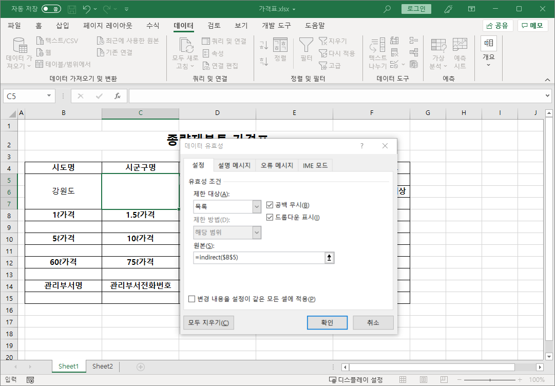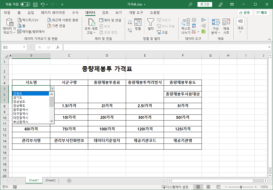 가격표 파일 Sheet1 시트로 가서 [B5] 셀에서부터 [데이터 유효성 검사] 기능을 설정합니다.