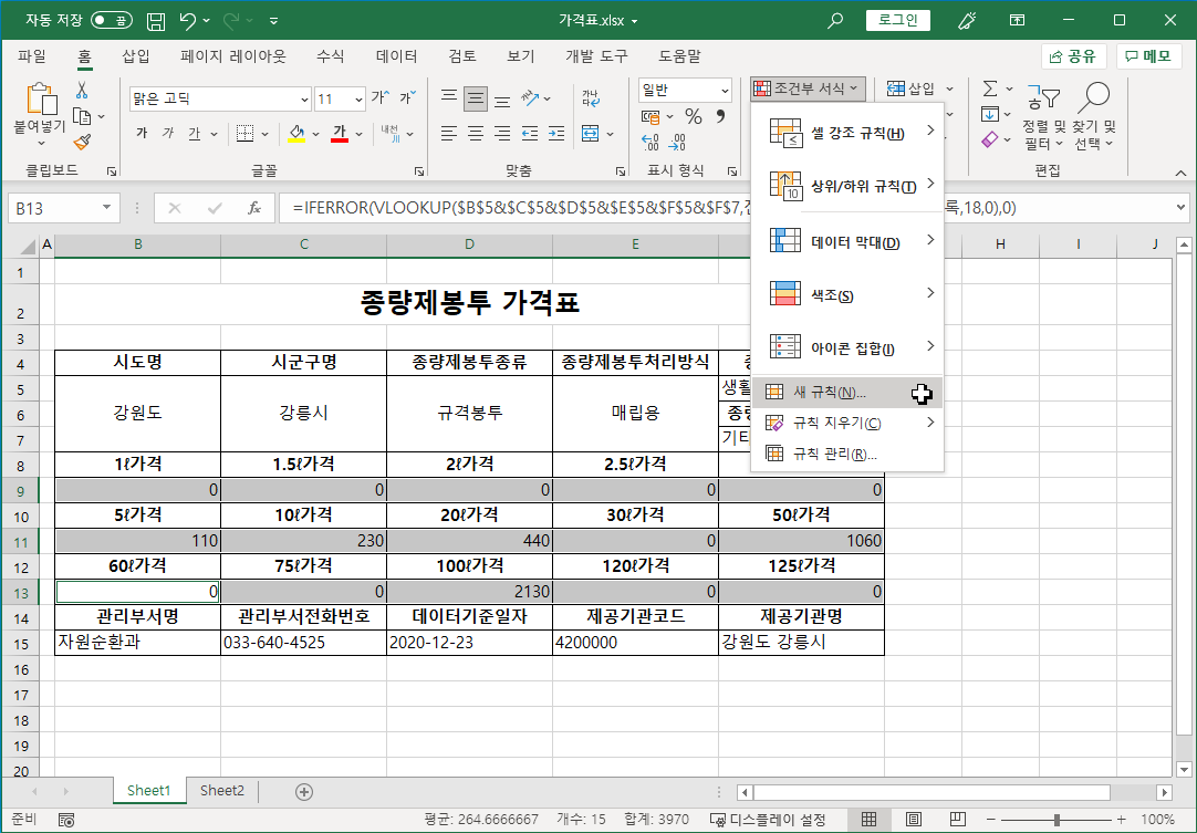 가격표 파일 Sheet2 시트 [B9:F15,B11:F11,B13:F13] 셀 범위를 한꺼번에 선택하고 [홈]-[스타일]-[조건부 서식]-[새 규칙]을 선택합니다.