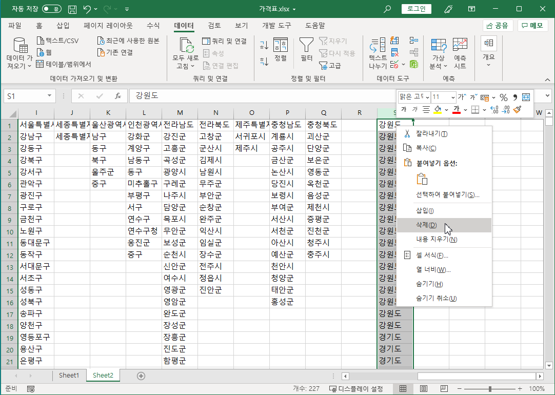 S열은 필요 없으니 삭제합니다.