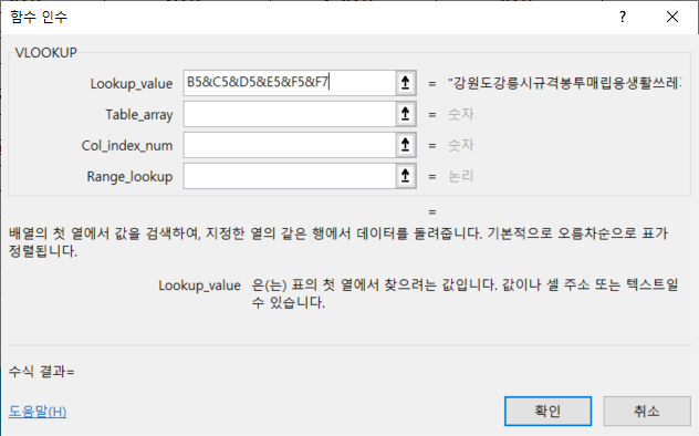 첫번째 Lookup_value 인수는 [B5], [C5], [D5], [E5], [F5], [F7] 셀을 순서대로 선택하면서 문자연결연산자 &(앰퍼센트)를 중간 중간 넣어 하나의 문자열이 되도록 입력합니다.