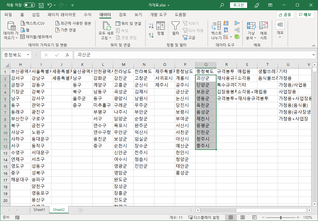 먼저 전국종량제봉투가격 파일에서 필요한 작업을 합니다.