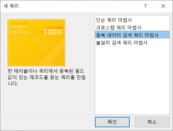 [중복 데이터 검색 쿼리 마법사]를 선택하고 [확인]을 클릭합니다.