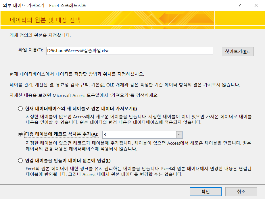실습파일.xlsx를 선택하고, '다음 테이블에 레코드 복사본 추가: B'를 선택한 뒤 [확인]을 클릭합니다.
