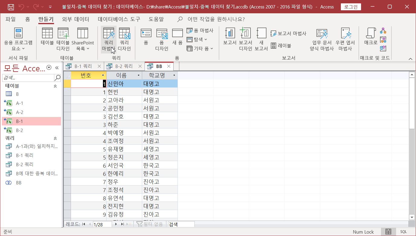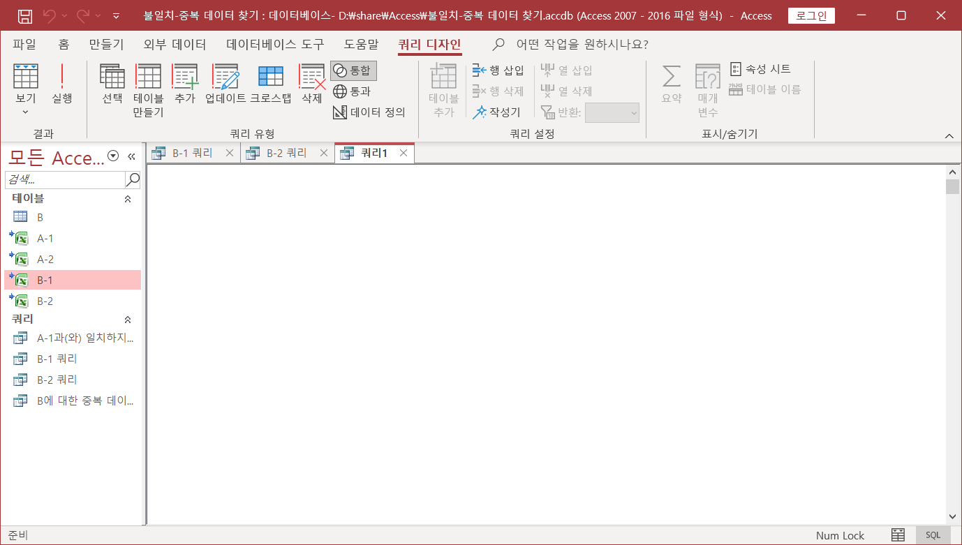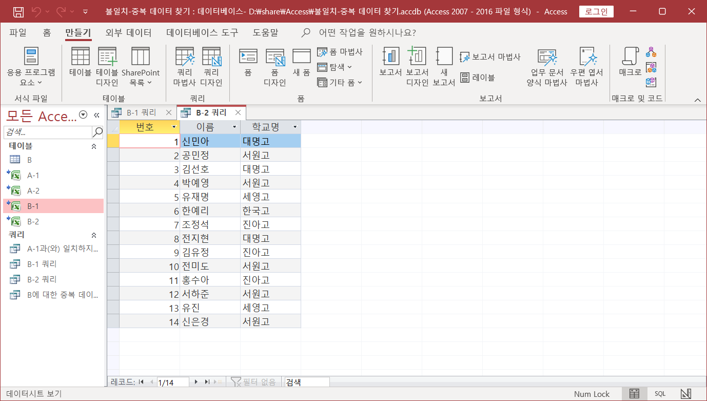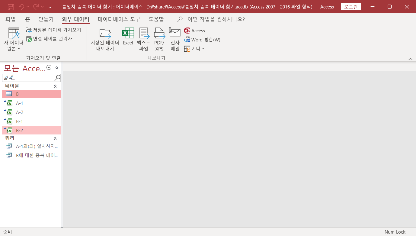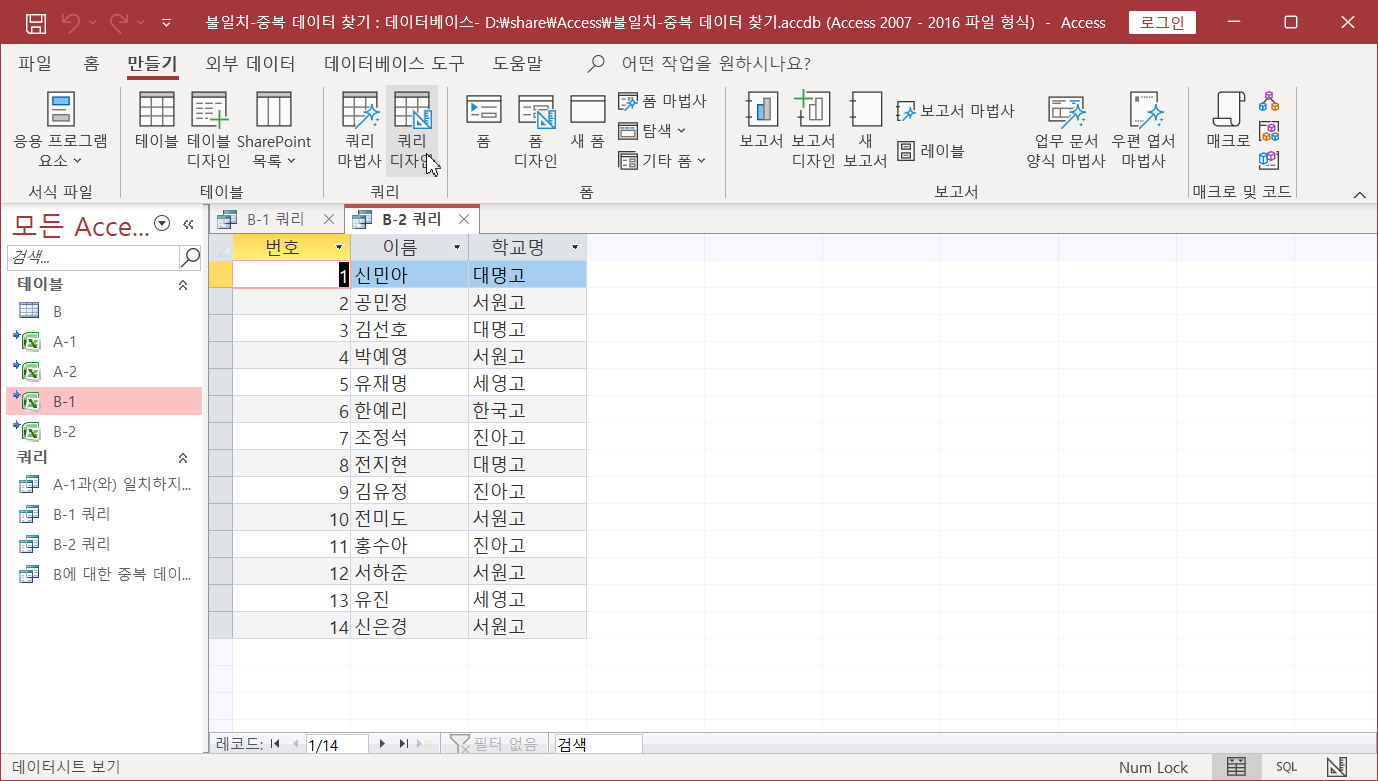 두 시트에서 불일치, 중복되는 데이터 찾기(Access 이용)