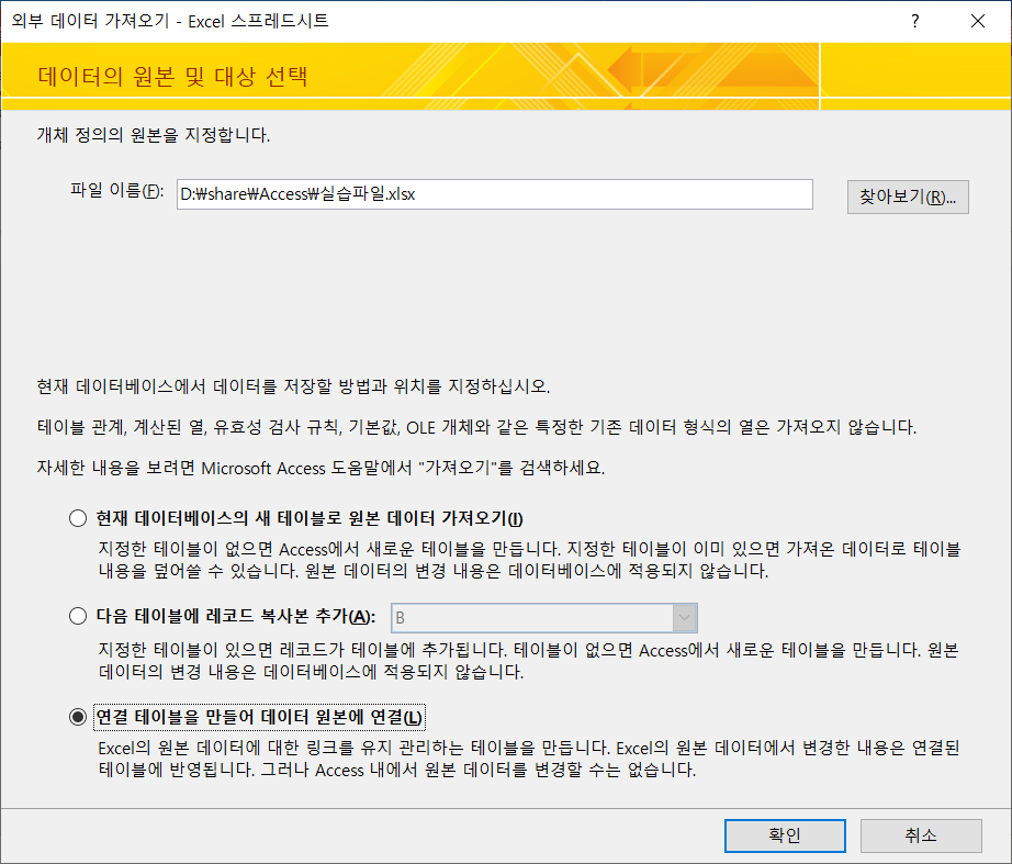 실습파일.xlsx를 선택하고, '연결 테이블을 만들어 데이터 원본에 연결'을 선택한 뒤 [확인]을 클릭합니다.