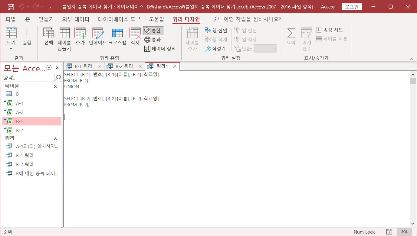 두 쿼리를 합칠 것이므로 [쿼리 디자인]-[쿼리 유형]-[통합]을 선택합니다.