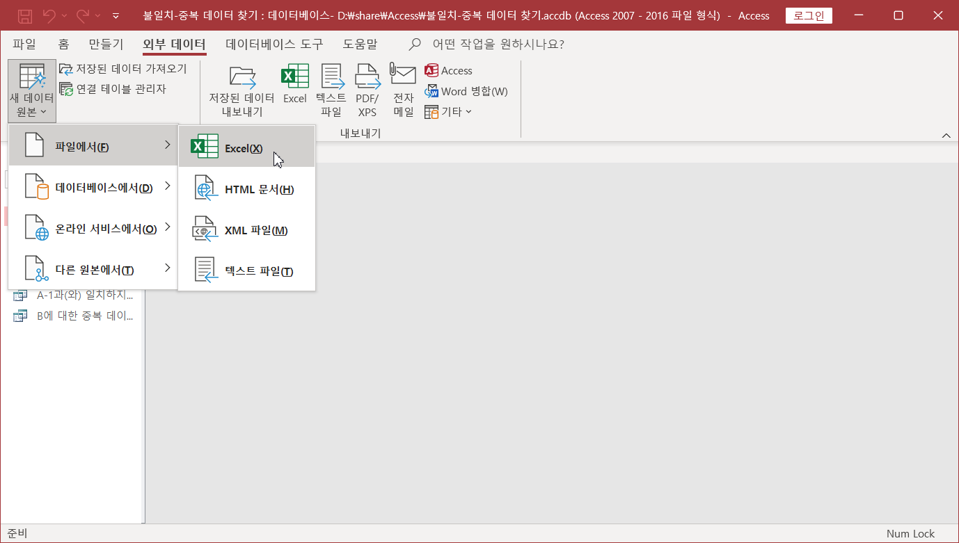 [외부 데이터]-[가져오기 및 연결]-[새 데이터 원본]-[파일에서]-[Excel]을 선택합니다.