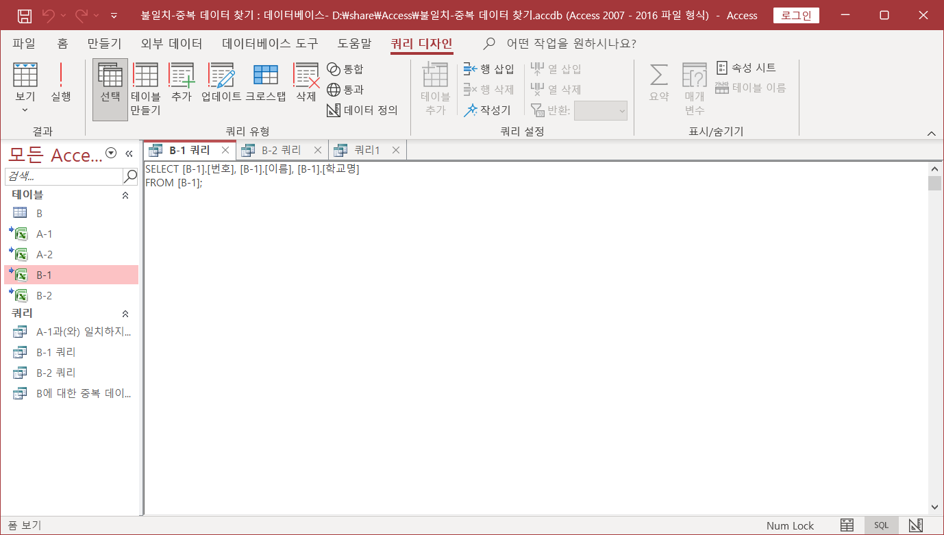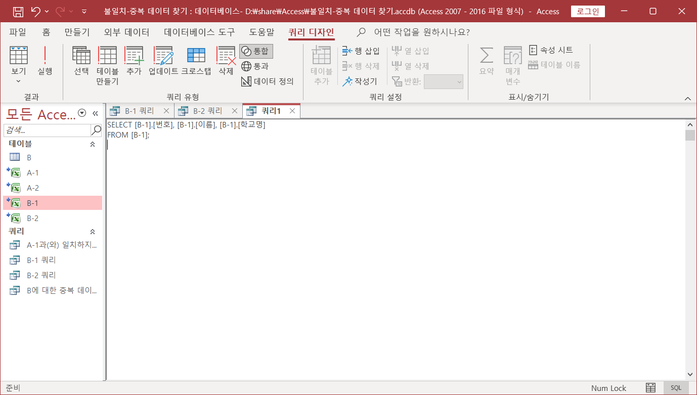 'B-1 쿼리'는 B-1 테이블 내용을 그대로 보여주는 역할입니다.