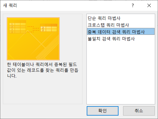 '중복 데이터 검색 쿼리 마법사'를 선택하고 [확인]을 클릭합니다.