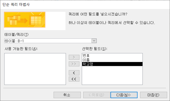 '테이블/쿼리'에서 'B-1'을 선택하고 '사용 가능한 필드'를 모두 '선택한 필드'로 옮긴 뒤 [다음]을 클릭합니다.