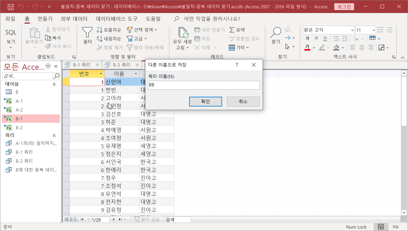 [저장]을 눌러 'BB'란 이름으로 쿼리를 저장합니다. 이름은 알아보기 쉽게 마음대로 정합니다.