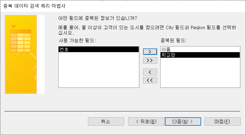 '어떤 필드에 중복된 정보가 있습니까?'에서 중복 여부를 판단할 필드로 이름과 학교명을 '중복된 필드'에 추가하고 [다음]을 클릭합니다.