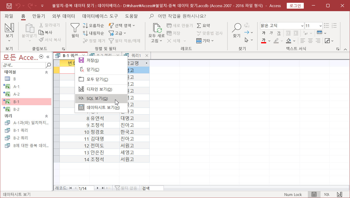 열려 있는 'B-1 쿼리'를 마우스 오른쪽 클릭해서 'SQL 보기'를 선택합니다.