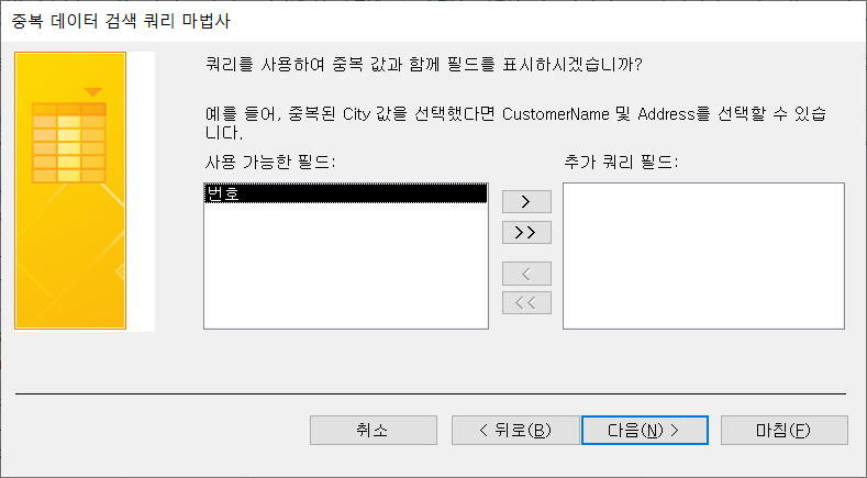 '쿼리를 사용하여 중복 값과 함께 필드를 표시하시겠습니까?'는 빈 상태로 두고 [다음]을 클릭합니다.