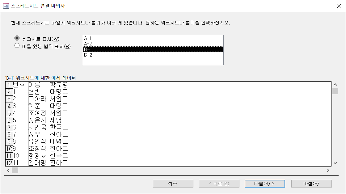 '연결 테이블 이름'은 시트 이름인 'B-1'을 그대로 두고 [마침]을 클릭합니다.