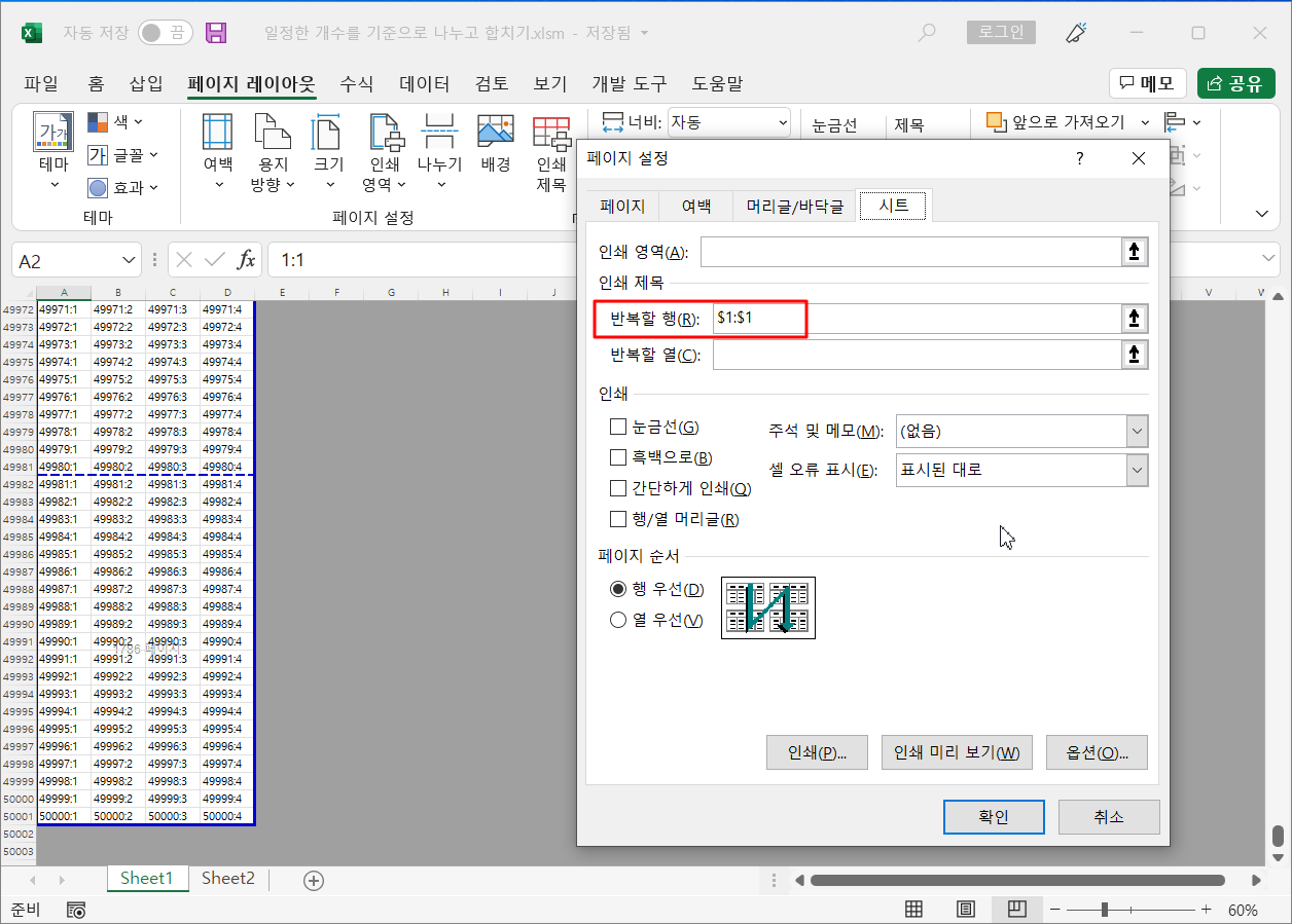 [페이지 레이아웃]-[페이지 설정]-[인쇄 제목]을 선택해서 [반복할 행]에 1행을 입력했습니다.