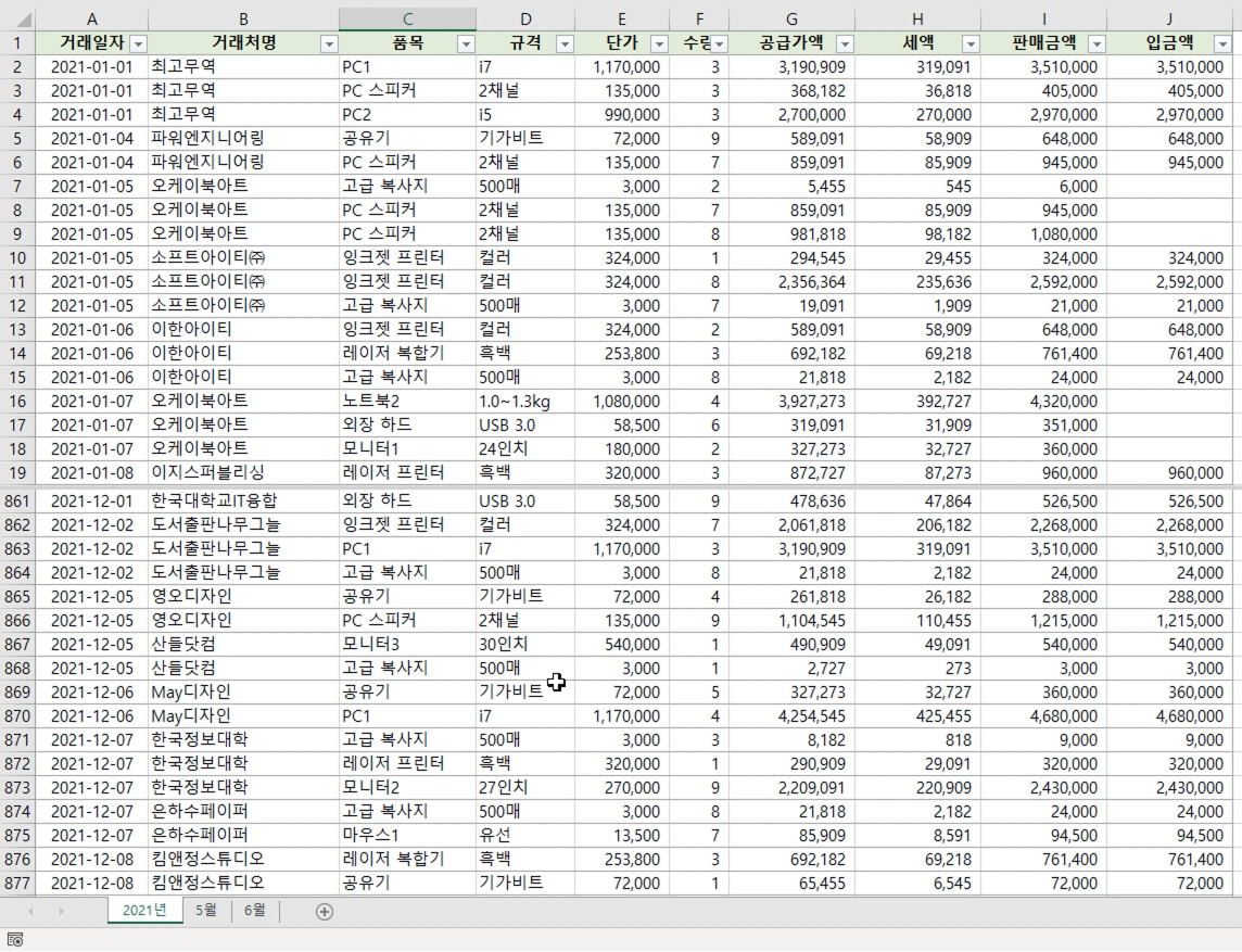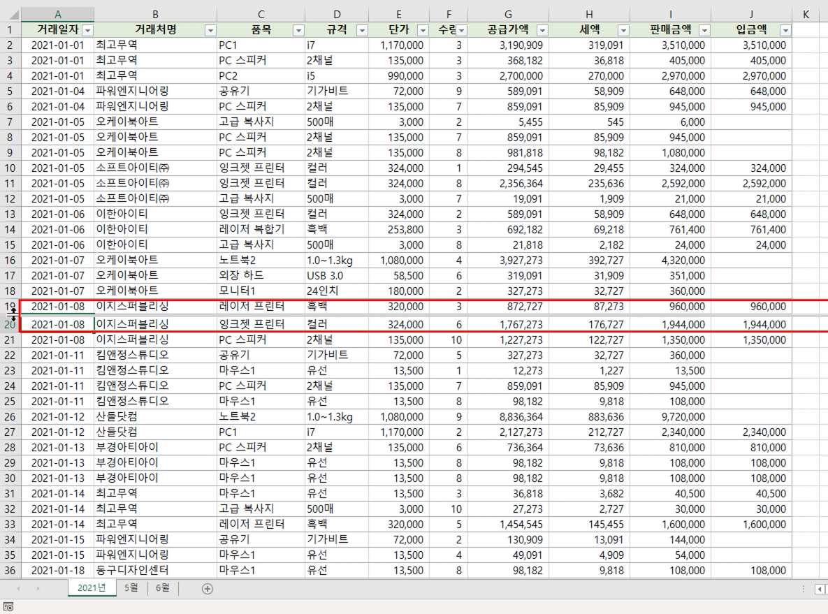 5월, 6월 거래 내역을 비교할 때 5월 시트를 눌렀다가 6월 시트를 누르면 매우 불편합니다.