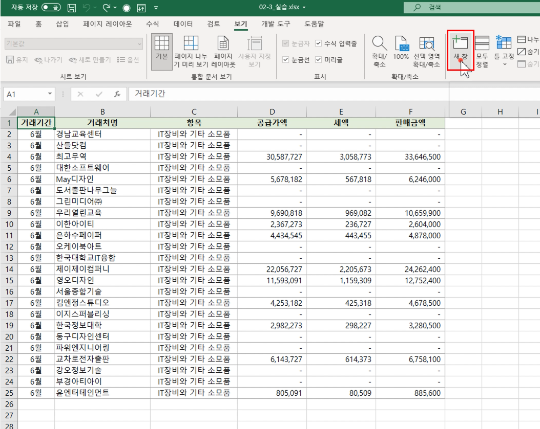 하나의 통합 문서에 작성된 두 시트를 비교하려면 현재 통합 문서를 별도의 창으로 하나 더 열어야 합니다.