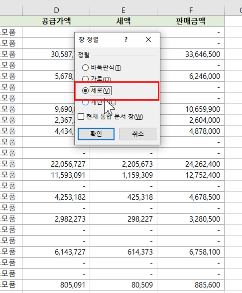 [보기] 탭 - [모두 정렬]을 선택합니다. [창 정렬] 대화 상자에서 '세로' 정렬을 선택하고 [확인]을 누릅니다.