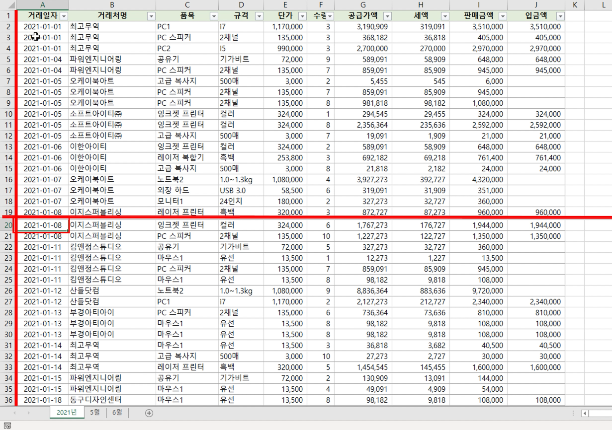 하나의 시트에 정리된 많은 양의 데이터 중 1월 거래 내역과 9월 거래 내역을 한 눈에 비교하기 쉽지 않습니다. 이 경우 창을 가로로 나누어 위쪽 창은 1월 데이터를 아래쪽 창은 9월 데이터를 볼 수 있도록 설정하면 편리합니다.