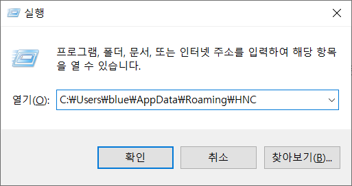 개인 데이터 폴더 경로 C:\Users\blue\AppData\Roaming\HNC 중 blue는 로그인한 사용자 이름을 나타내는 것으로 컴퓨터마다 다릅니다.