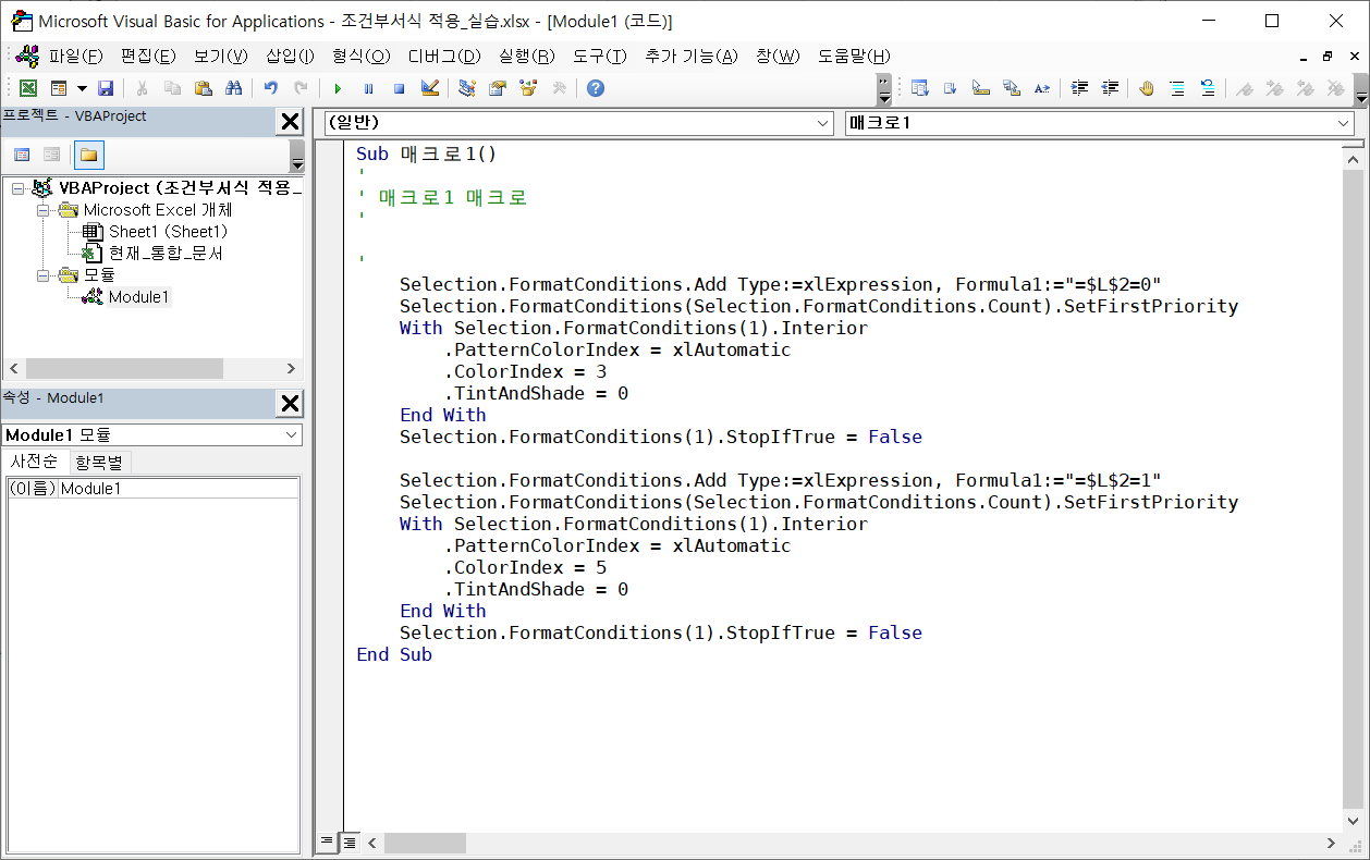 VBE가 실행되고 만들어진 매크로 코드가 보입니다.