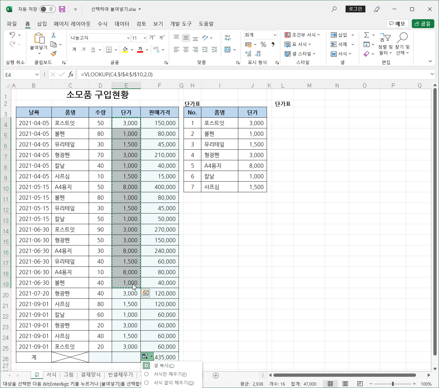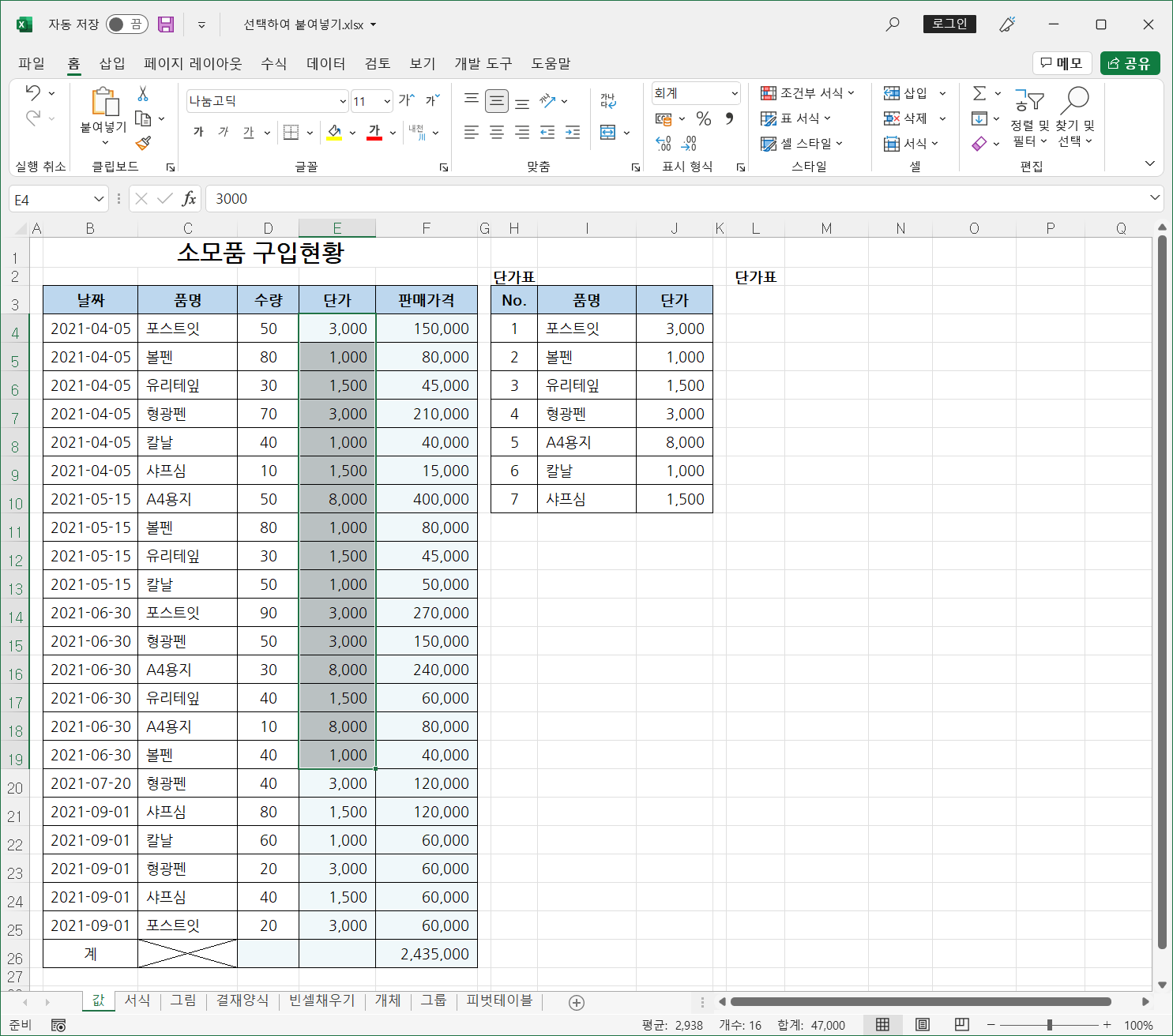 두번째는 이미 구해진 단가는 수식을 값으로 바꿔 기록해 두는 것입니다.
