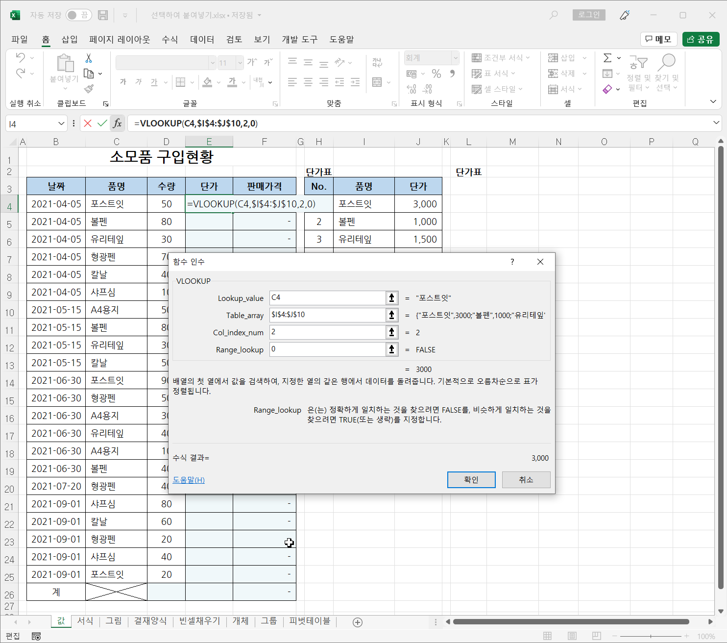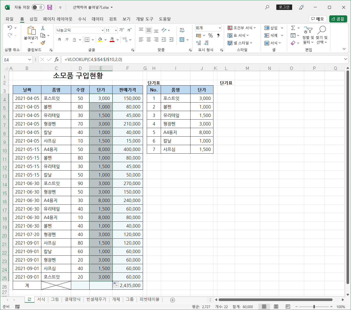VLOOKUP 함수를 이용해 단가를 찾아 입력했는데, 단가가 바뀌어 수정했더니 기존에 입력한 단가도 같이 변경되는 경우 문제를 해결하는 방법을 소개하겠습니다.