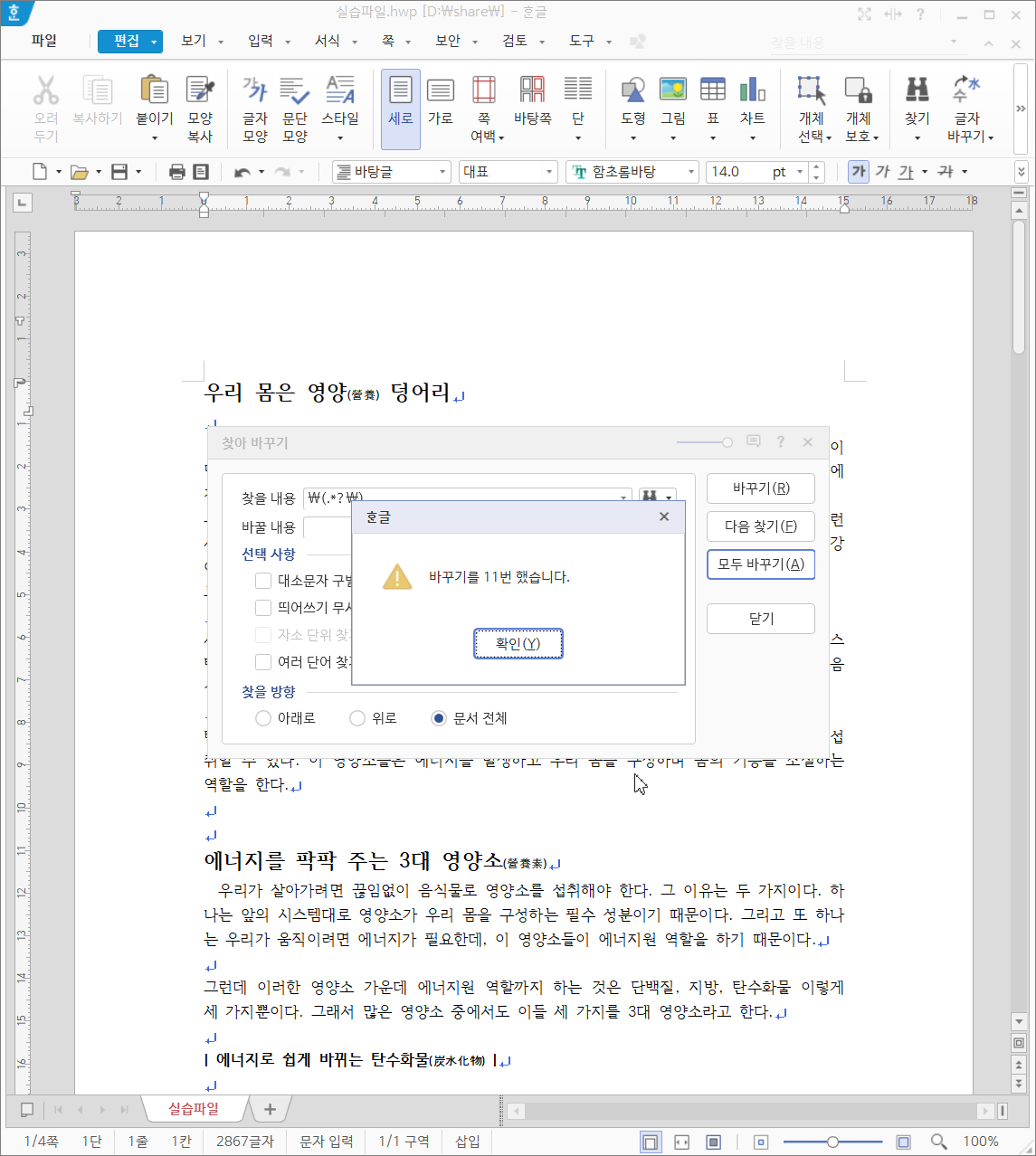 괄호가 많지 않다면 직접 찾아서 수정해도 되지만, 문서 분량이 많고 바꿔야할 내용도 아주 많은 경우에 일일이 수정하기 보다는 기능을 이용해 빠르고 정확하게 작업하는 것이 좋습니다.