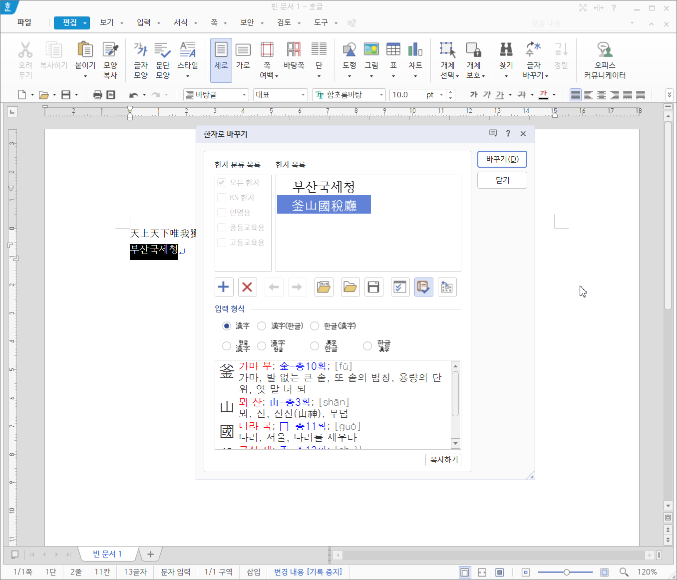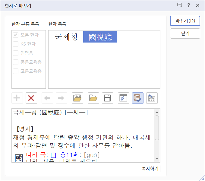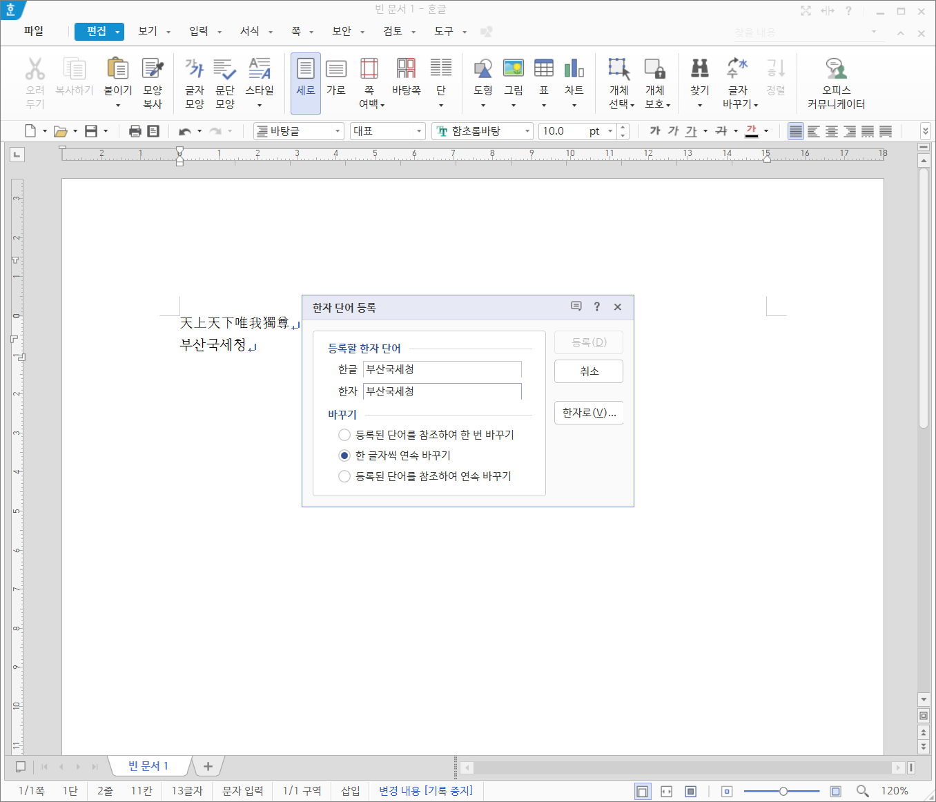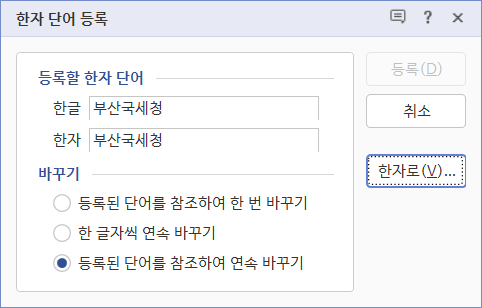 한자 항목의 한글을 한자로 바꿔야 하는데 이때도 등록된 단어를 참조하여 연속 바꾸기를 선택하면 쉽게 바꿀 수 있습니다.