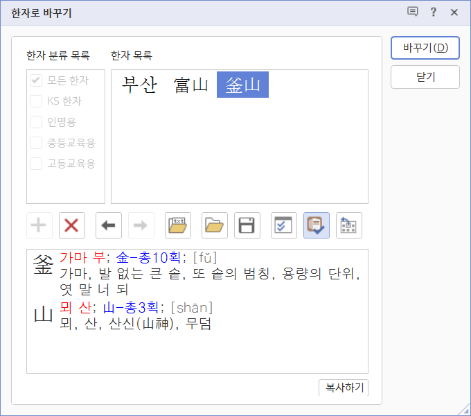 이름을 한자 단어로 등록하는 경우에는 한 글자씩 연속 바꾸기 옵션을 선택해야 선택하려는 한자를 확인할 수 있습니다.