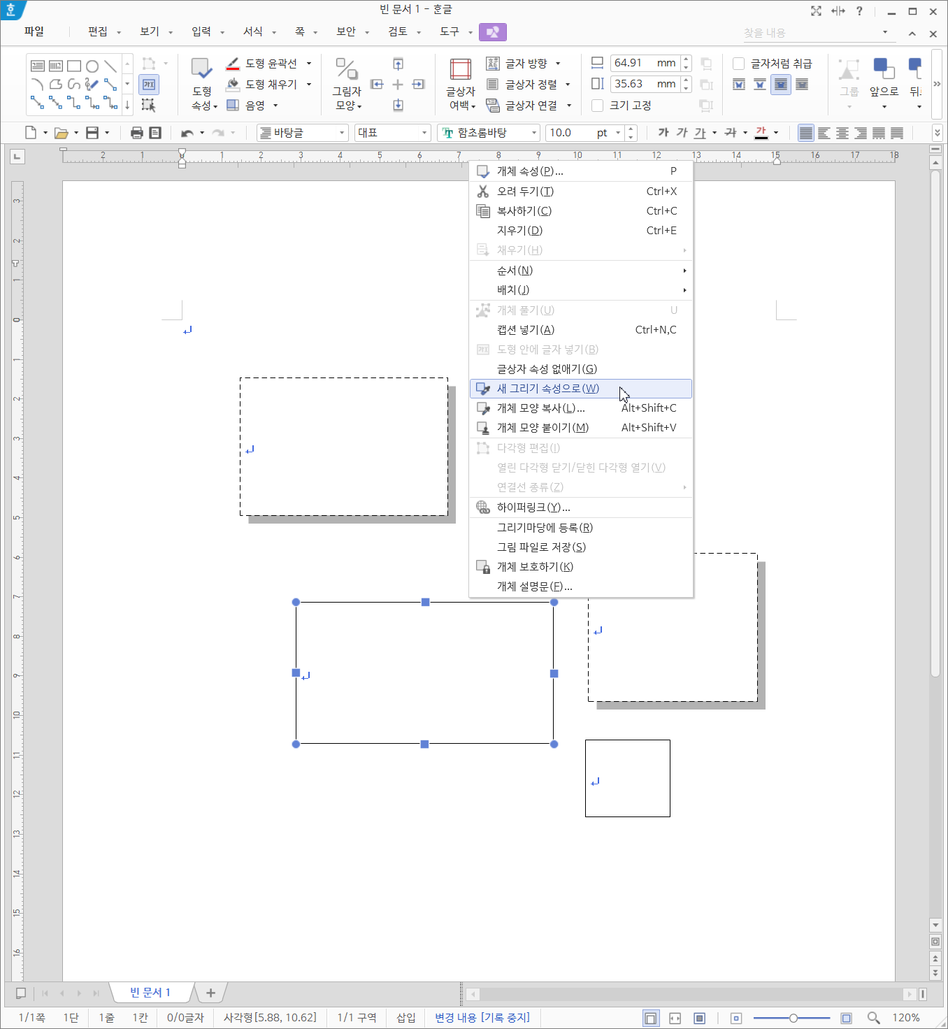 그런 다음 도형을 선택하고 마우스 오른쪽 클릭해서 다시 [새 그리기 속성으로(W)]를 선택합니다.