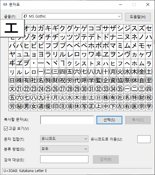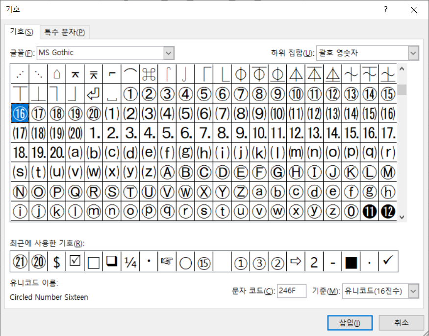 글꼴 항목에서 MS Gothic을 선택하고, 하위 집합 항목에서 괄호 영숫자를 선택합니다.