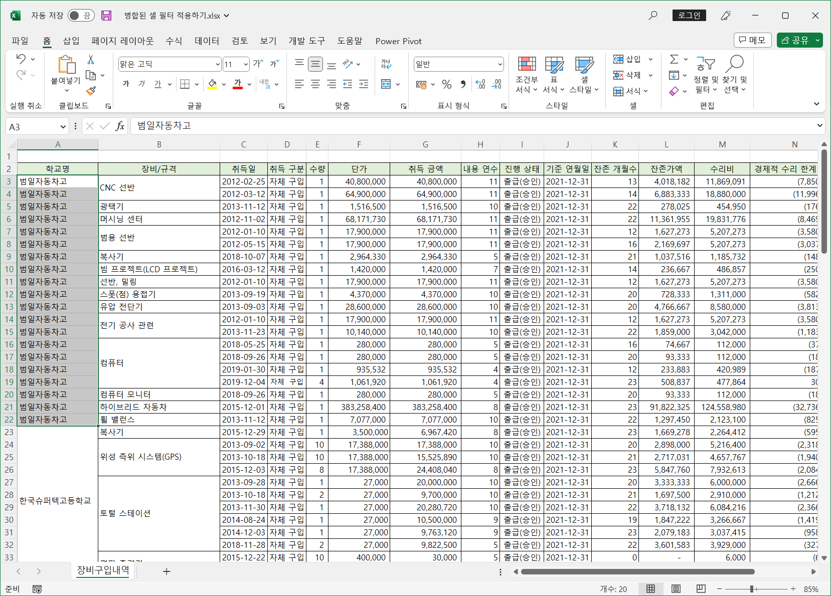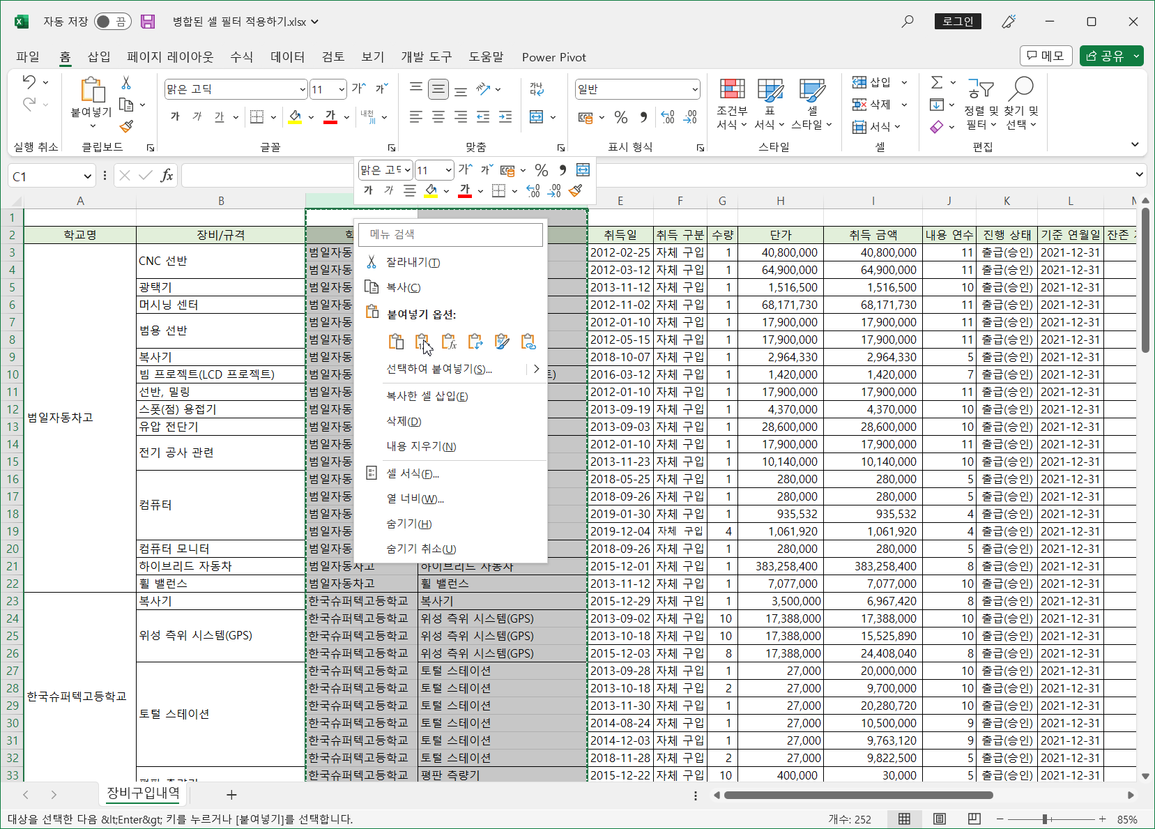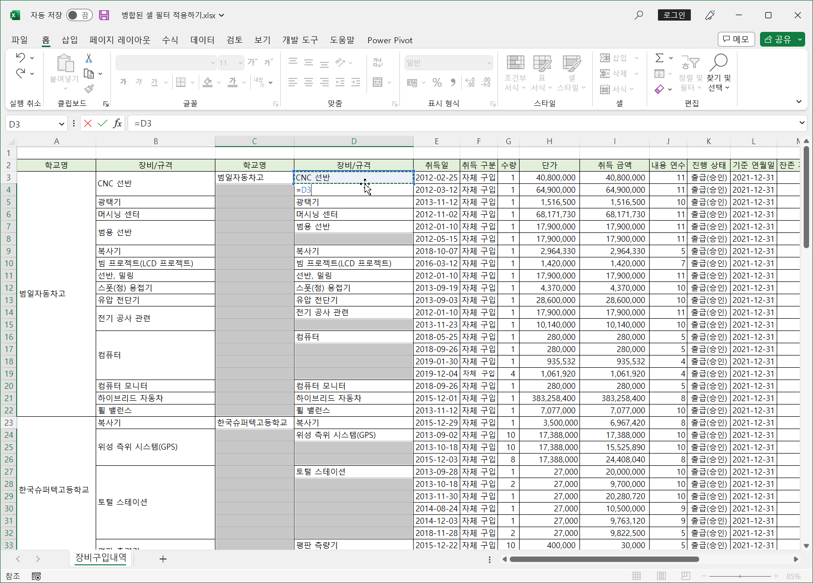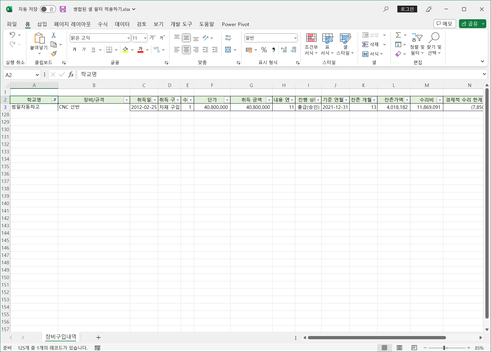 이렇게 병합된 셀은 필터를 적용하면 병합된 범위의 첫번째 셀만 나타나고 나머지는 값이 없어 표시되지 않습니다.