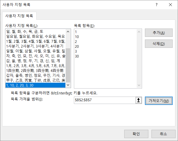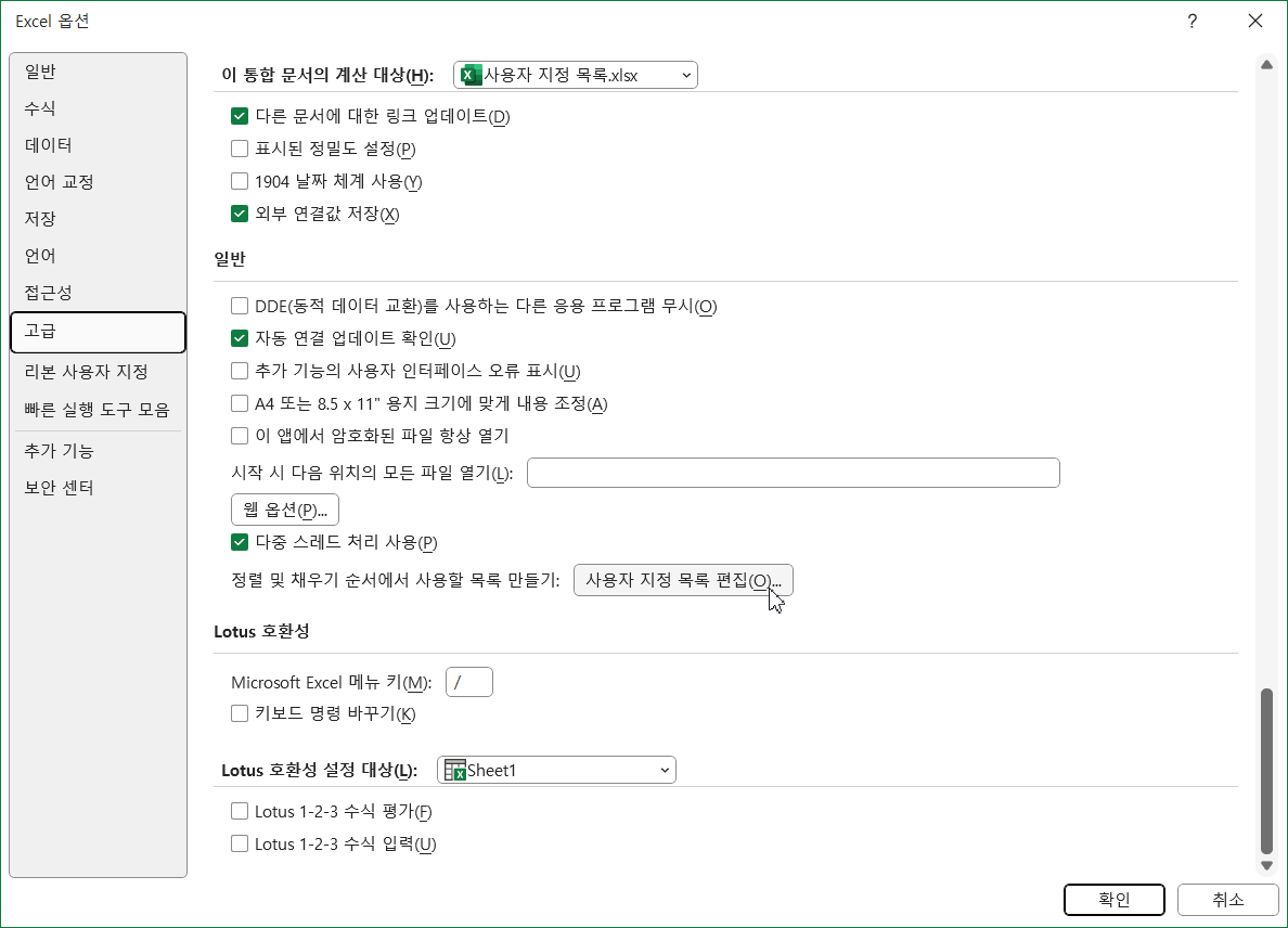 새 목록을 추가하기 위해 [파일]-[옵션]-[고급]-[사용자 지정 목록 편집]을 선택합니다.