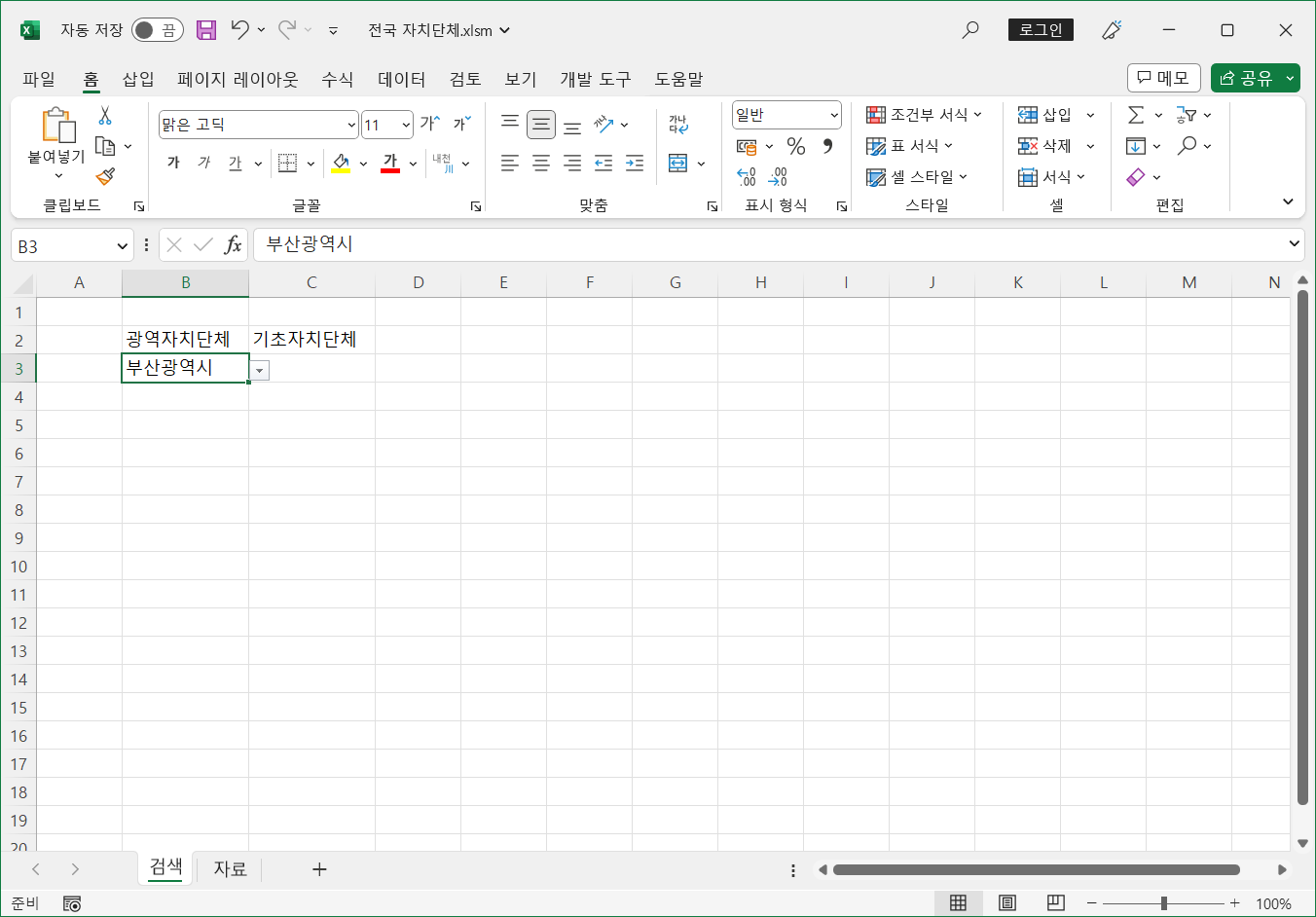광역자치단체 목록과 각 광역자치단체의 기초자치단체 목록을 자료 시트에 정리해 두고, 검색 시트에서 데이터 유효성 검사 기능과 이름 정의 기능, INDIRECT 함수를 이용해 찾도록 구현했습니다.