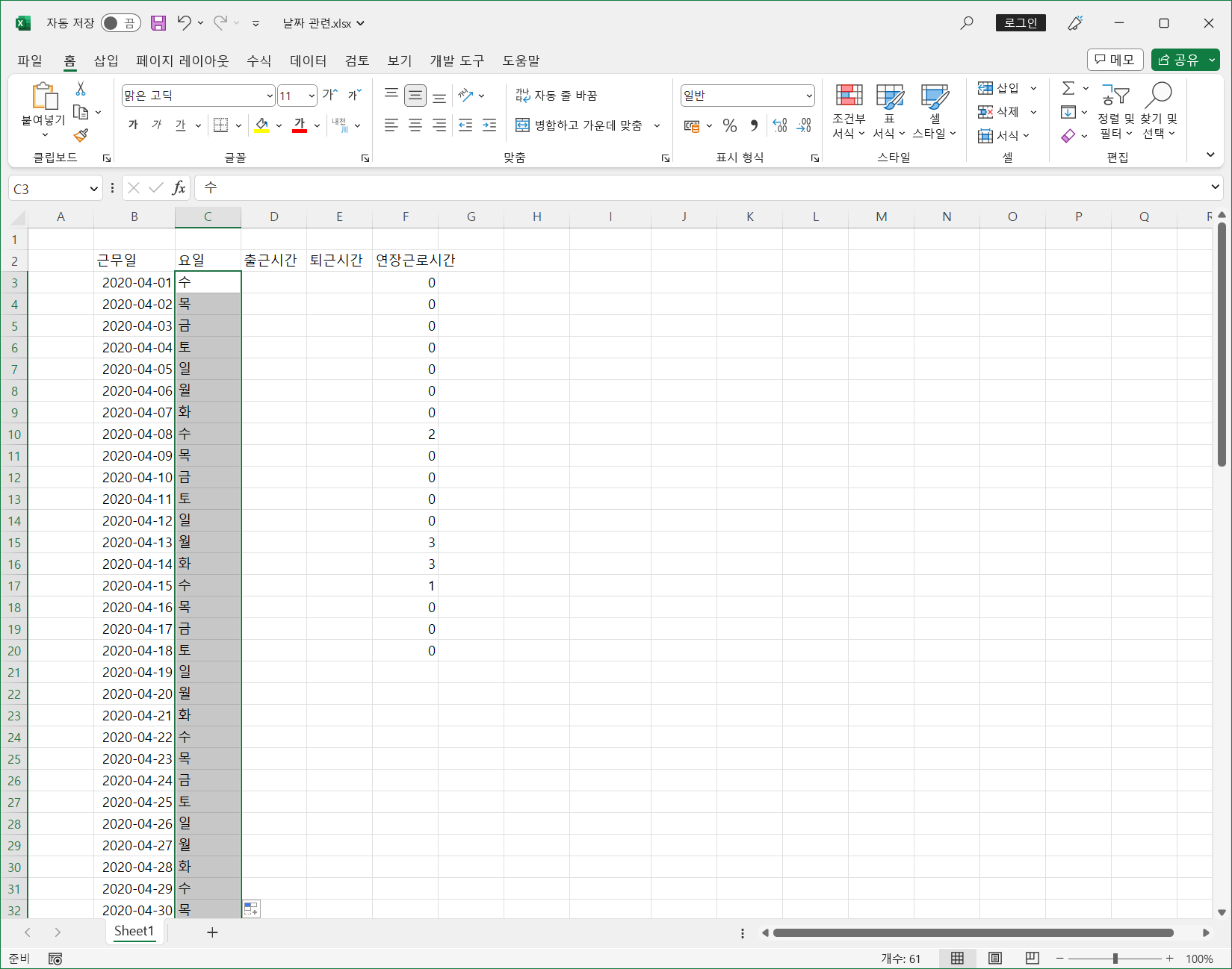 요일은 사용자 지정 목록에 등록되어 있어 하나의 항목만 입력하고 채우기 하면 자동으로 입력됩니다.