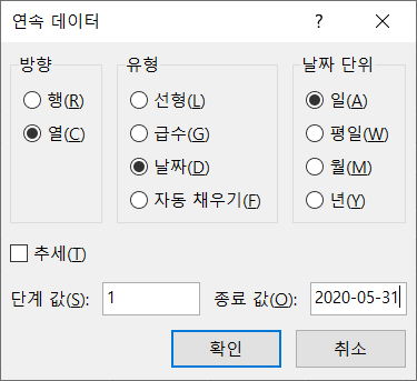 방향은 '열', 종료 값은 2020-05-31을 입력하고 [확인]을 클릭합니다.