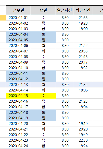 이제 첫 번째 문제인 출근시간에 토, 일을 제외하고 8:30을 입력하는 것입니다.