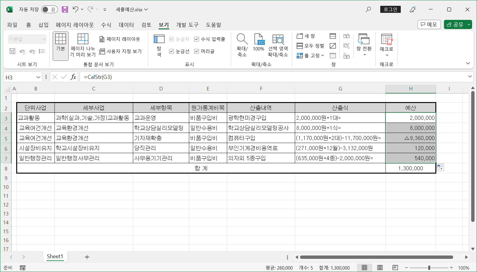 수식을 수정하거나 산출식 셀의 내용을 바꾸면 사용자 정의 함수 CalStr을 이해할 수 없기 때문에 #NAME? 오류 메시지가 표시됩니다.