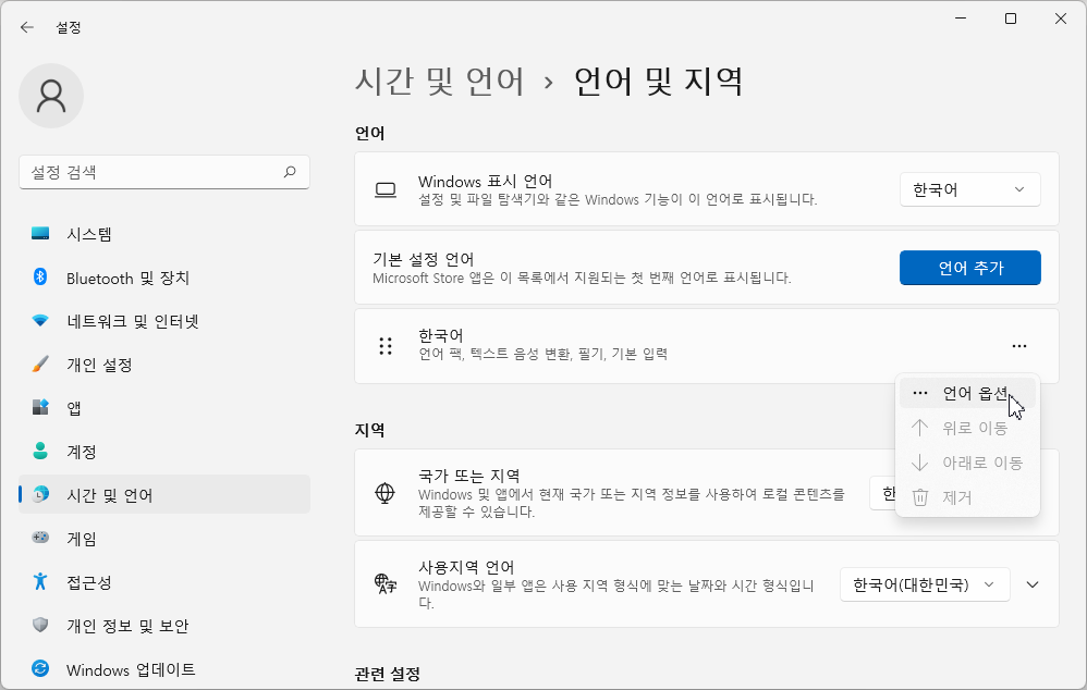 [한국어] 항목에서 [언어 옵션]을 선택합니다.