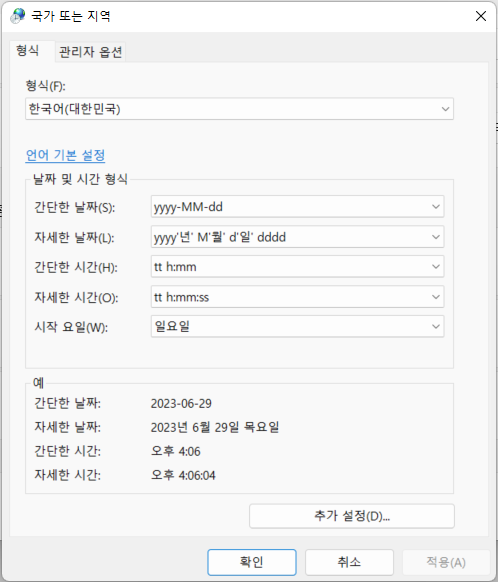 [국가 또는 지역] 대화상자에서 [형식] 탭을 선택하고 아래 [추가 설정]을 선택합니다.