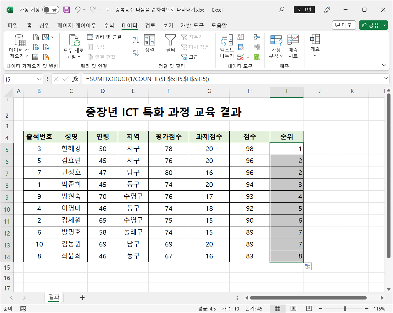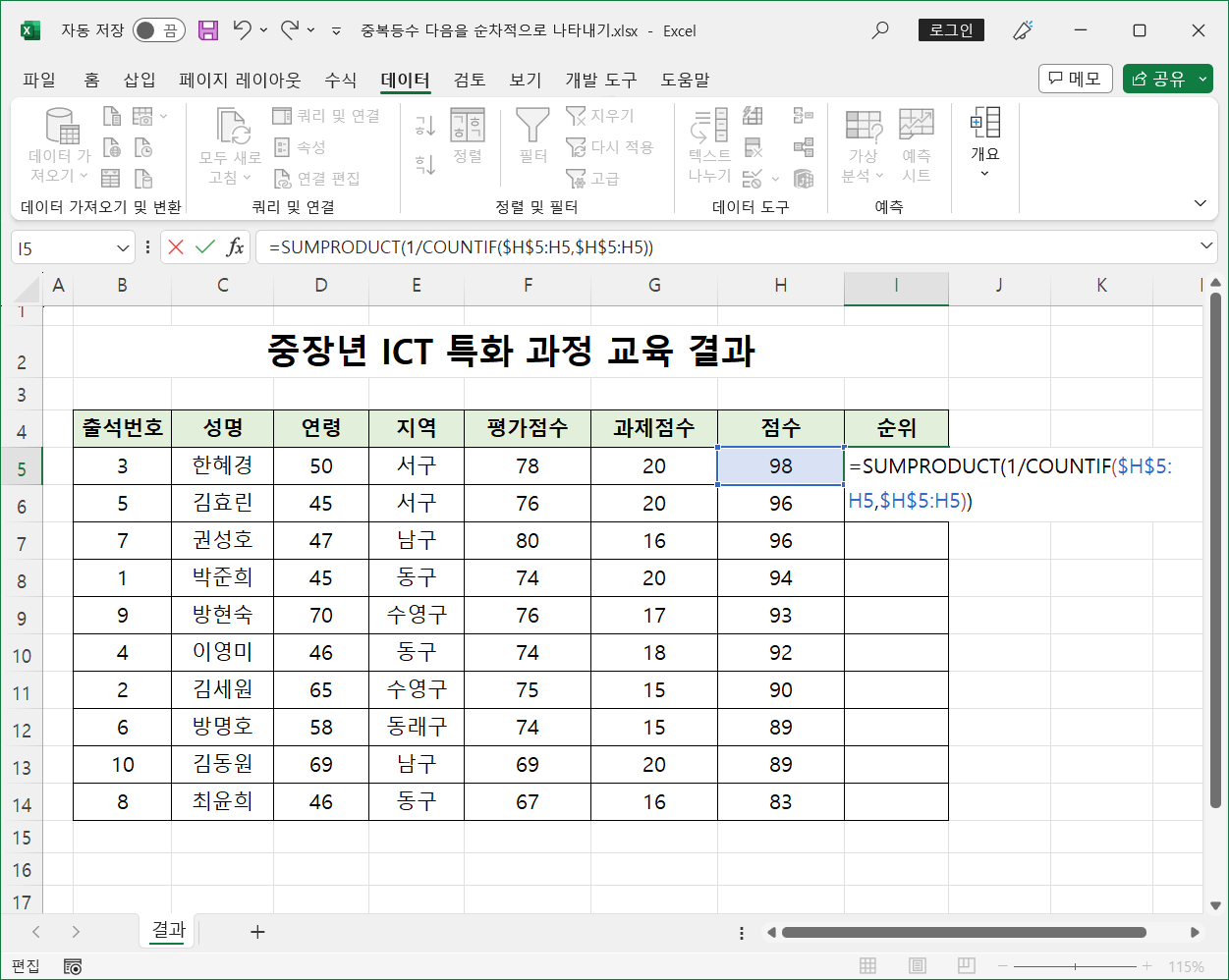 SUMPRODUCT 함수와 COUNTIF 함수를 이용한 수식은 점수를 인식해서 등수를 매긴 것이 아니라 순서대로 번호를 매기는 역할을 합니다.
