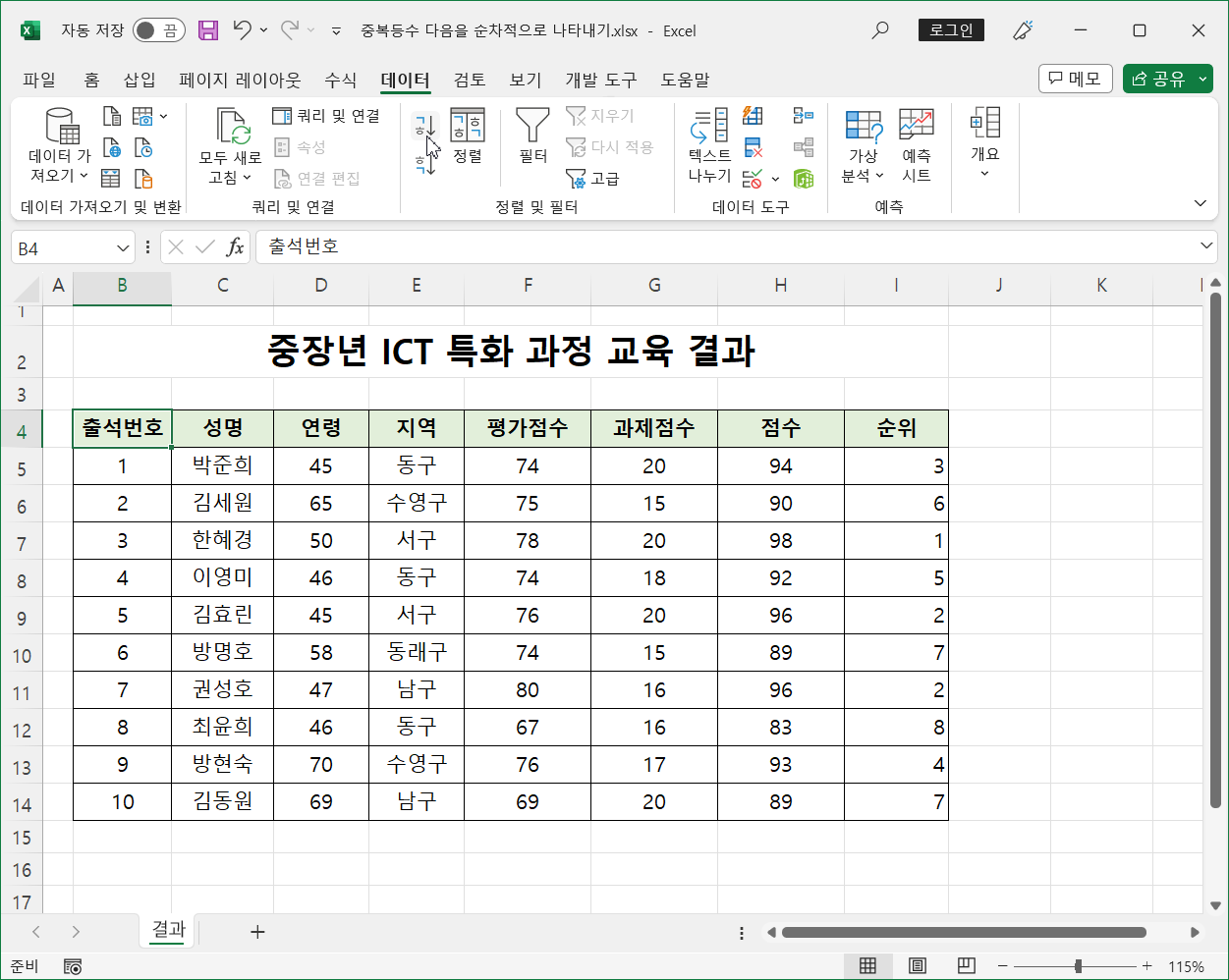 만약 등수를 구하려는 데이터에 출석번호와 같은 원래 순서를 나타내는 필드가 없다면 점수로 정렬하기 전에 임의로 필드를 하나 추가해서 순번을 매기고 등수를 구한 뒤 다시 되돌린 다음 해당 필드는 없앱니다.