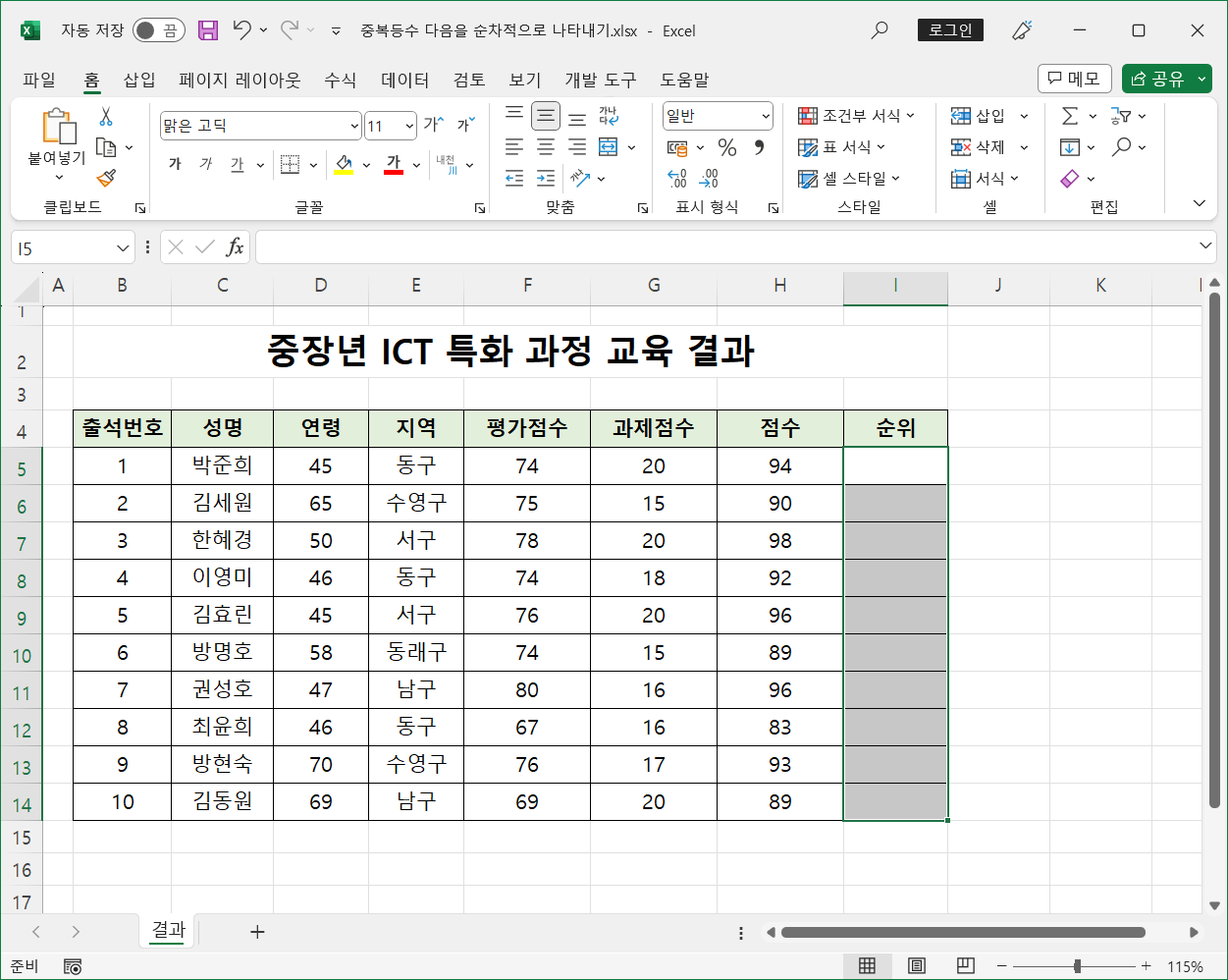 새롭게 순위를 구하기 위해 I열 순위를 지웁니다.