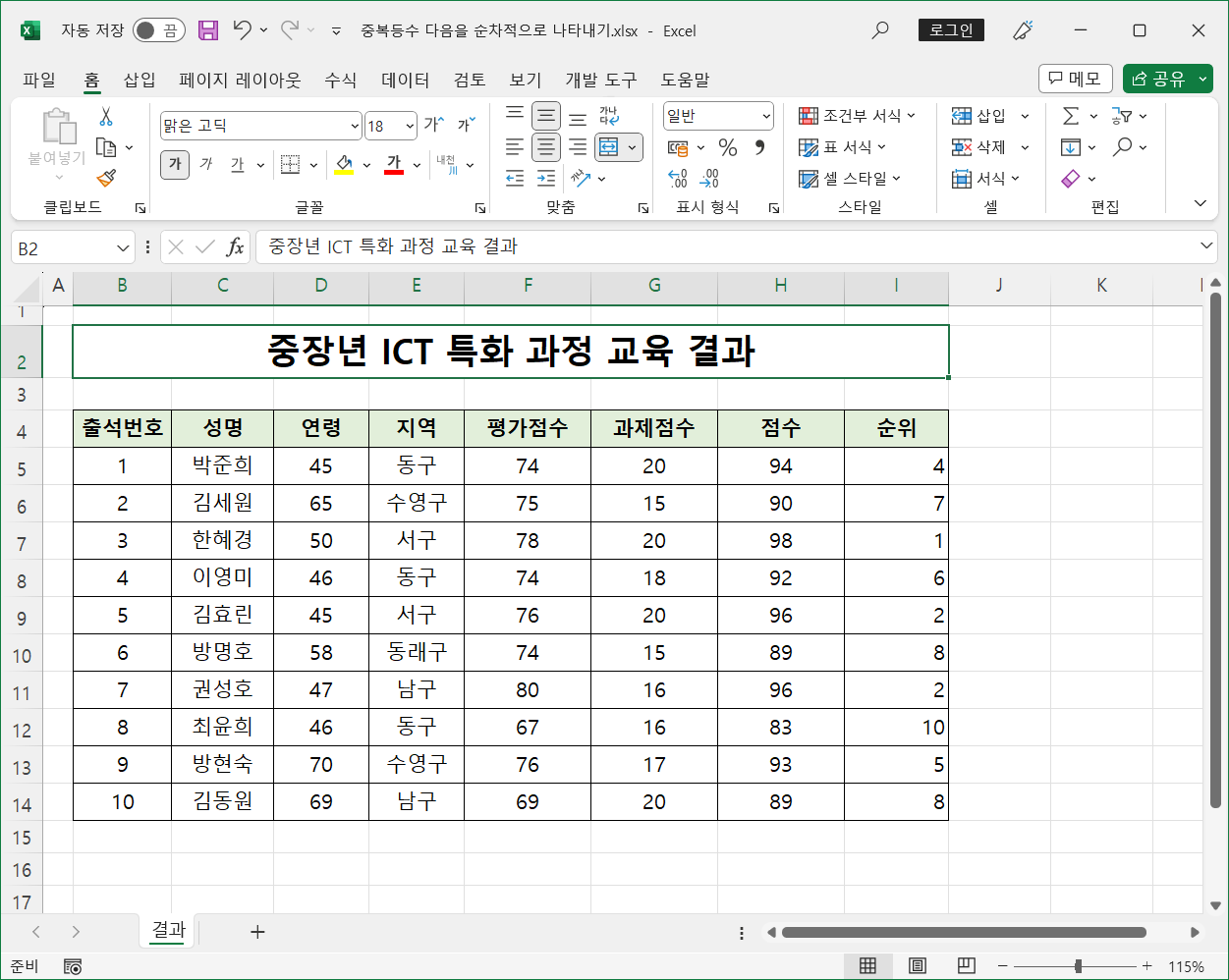 그래서 점수를 기준으로 정렬한 뒤 함수로 등수를 구하고 값으로 변환해서 원래 순서대로 되돌린 것입니다.