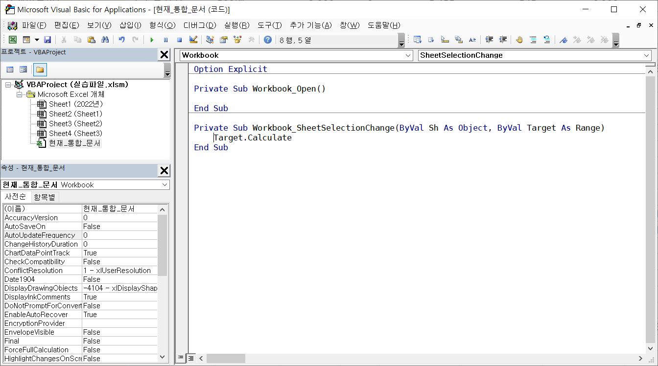 왼쪽 프로젝트 탐색기에서 현재_통합_문서를 더블클릭해서 코드 창에 나타내고 Workbook 개체 SheetSelectionChange 이벤트를 선택해서 붙여넣기 합니다.