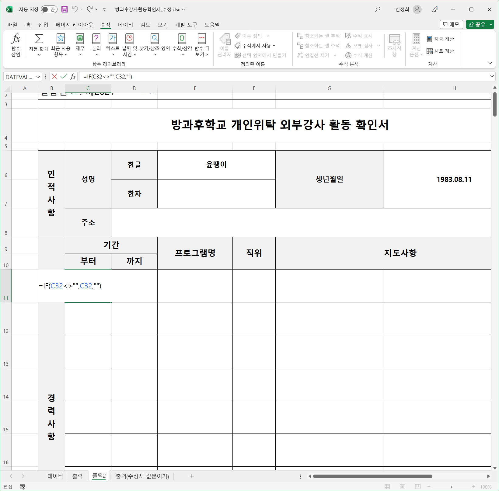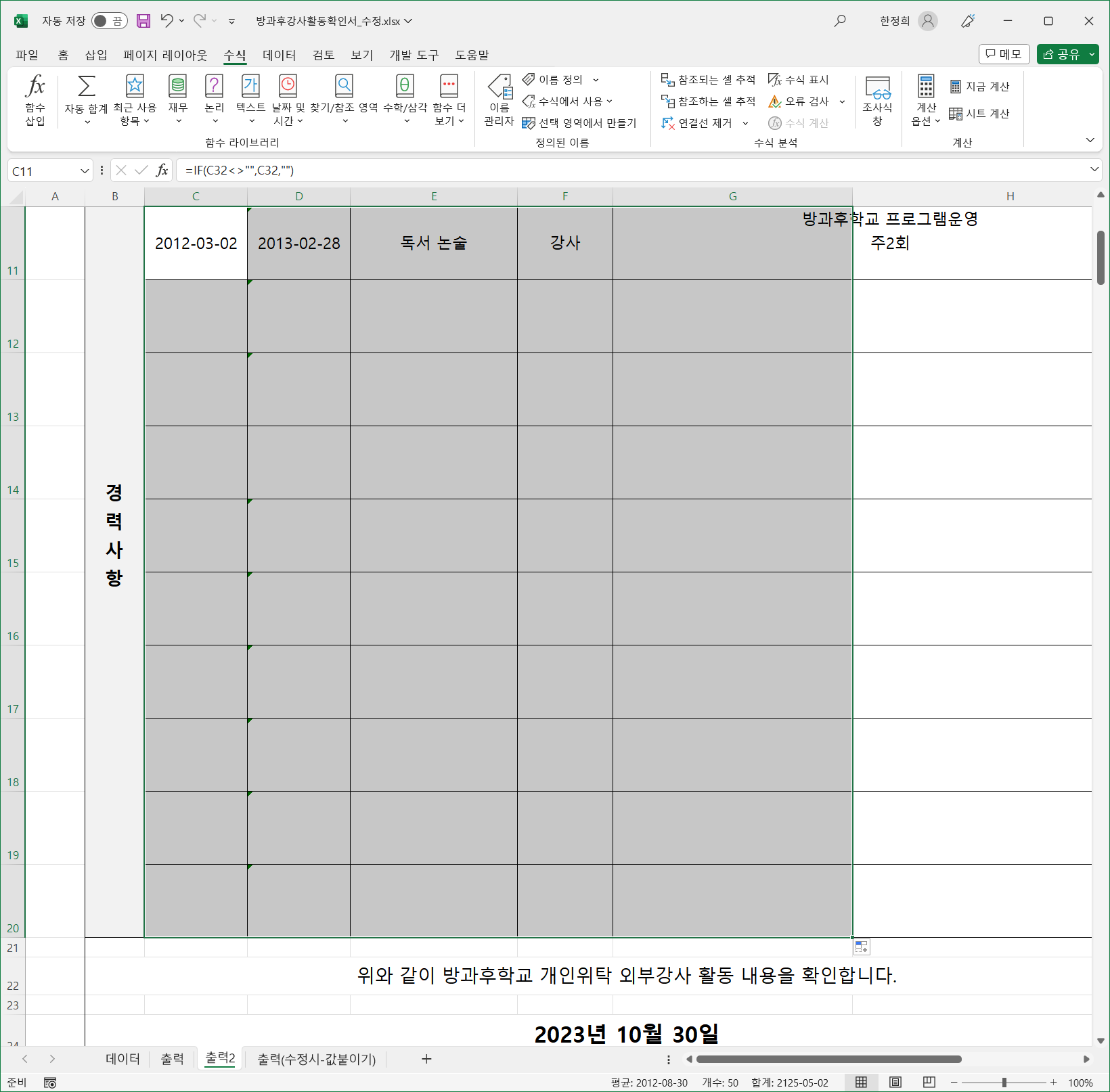 출력(수정시-값붙이기) 시트에서 사용할 수 있도록 전체 경력사항을 나타내는 수식을 추가합니다.