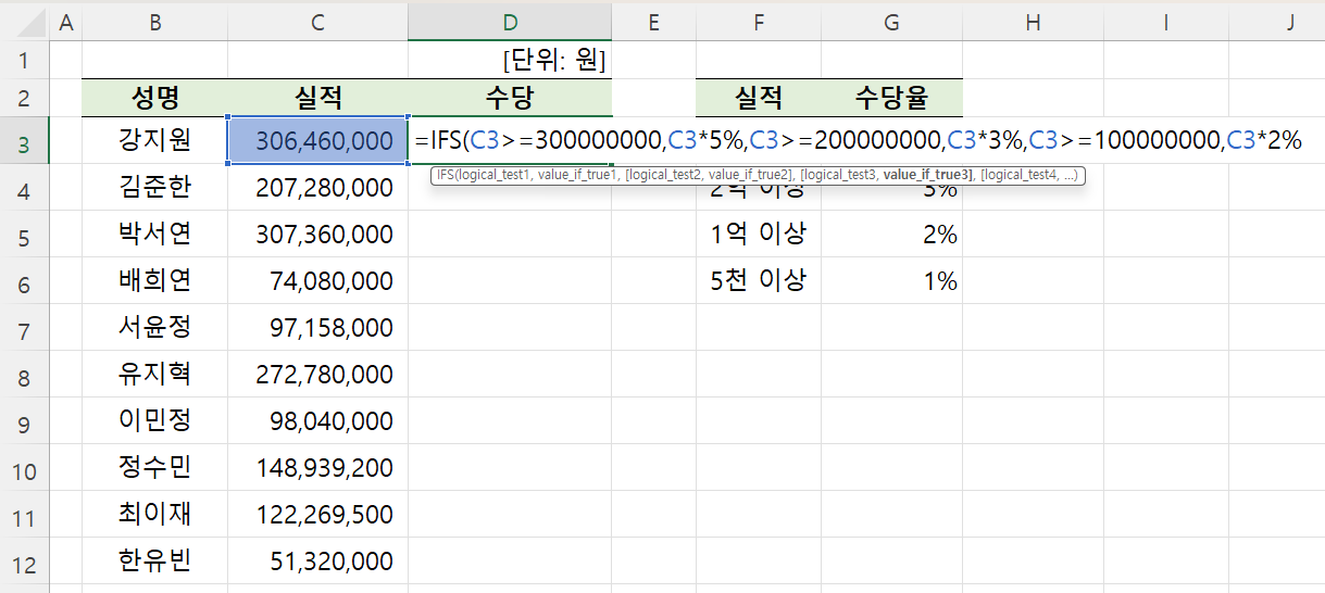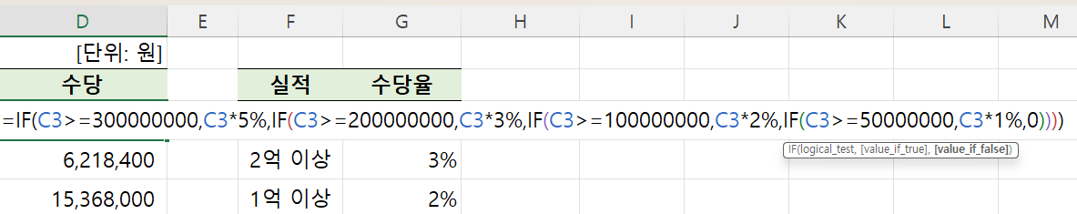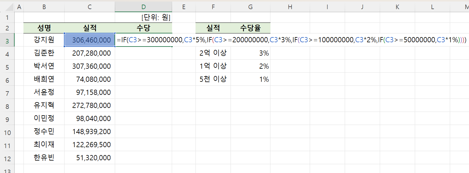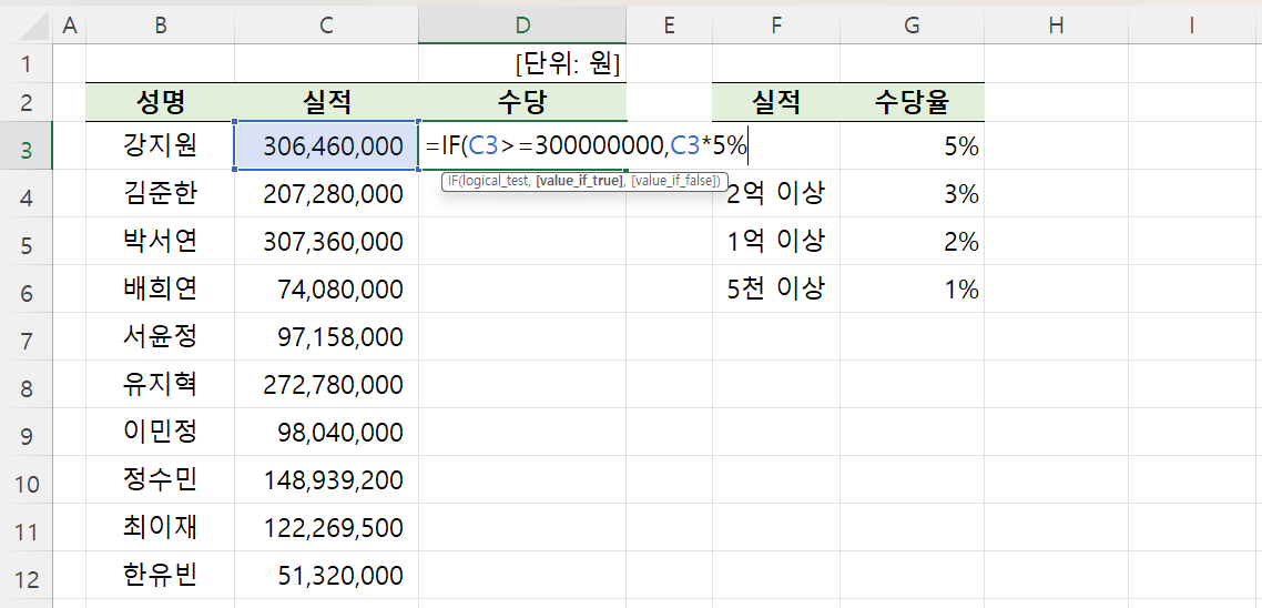 1. IF 함수를 입력하고 괄호를 연 다음 첫 번째 인수를 작성합니다. C3>=300000000(실적이 3억 이상)인지 조건을 작성합니다. 3억 이상이면 C3*5%(실적 곱하기 5%)인 참의 결과를 수식으로 작성합니다.