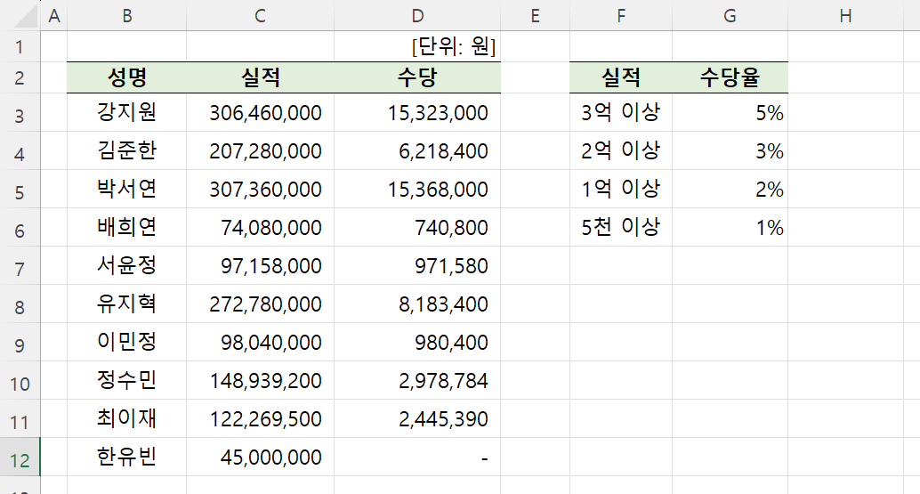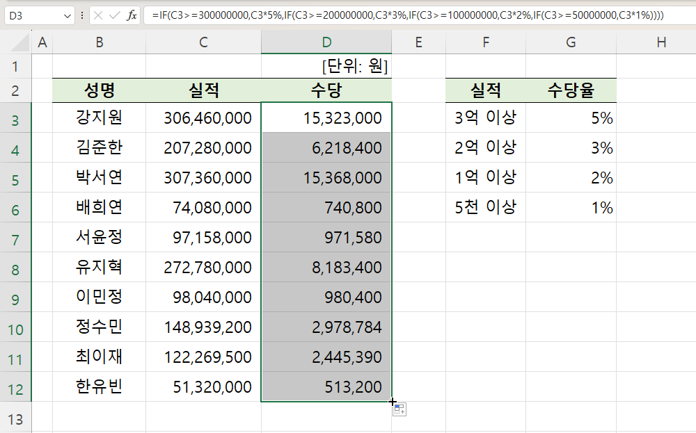 수식을 복사해 결과를 확인해보면 정확하게 수당이 구해진 것을 알 수 있습니다. 마지막 한유빈의 실적을 45,000,000으로 변경해보면 5천만 원 미만인 경우 수당이 0으로 표시되었죠?